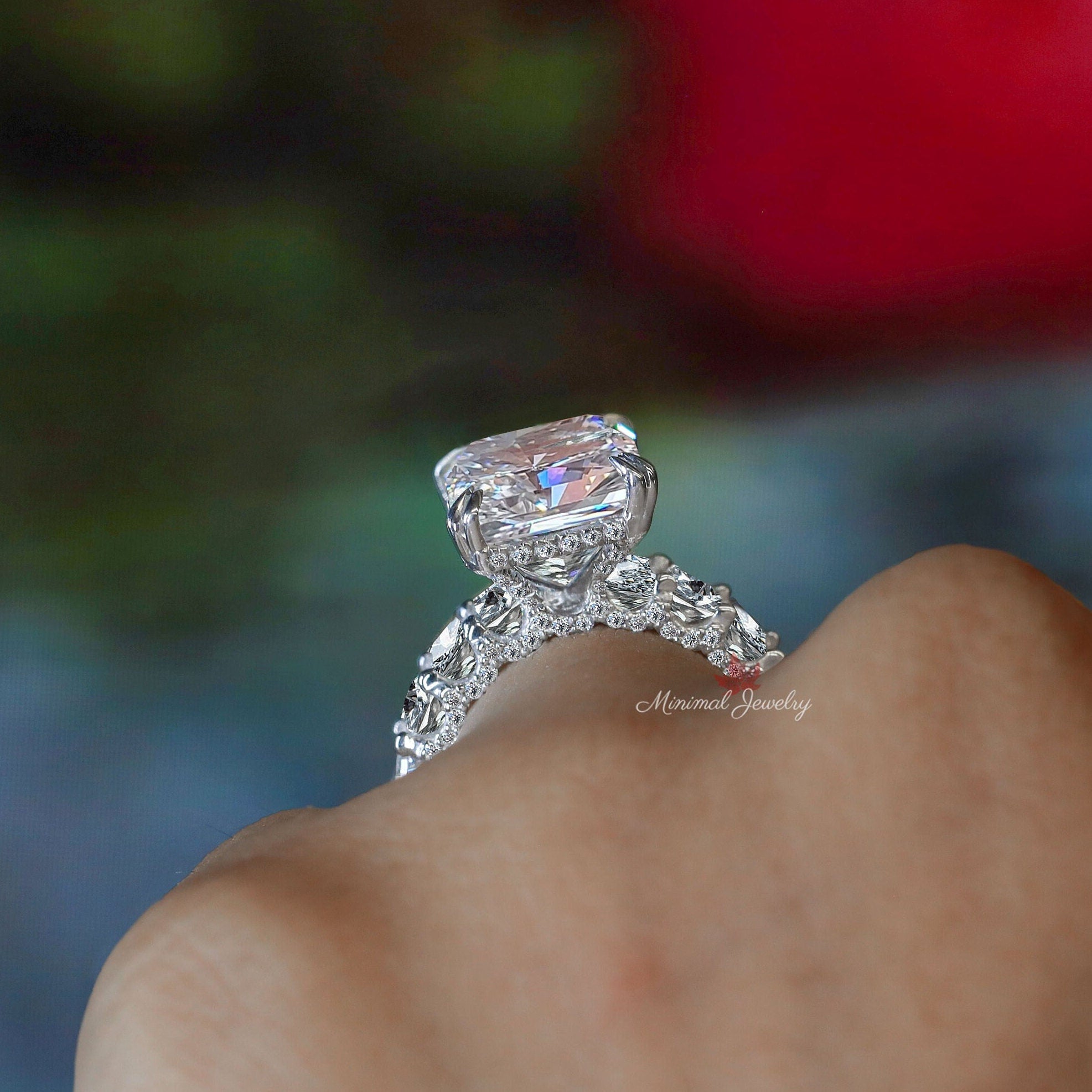 10 CT Moissanite radiant cut engagement ring,hidden halo solitaire,wide eternity band,celebrity style big large radiant cut moissanite ring