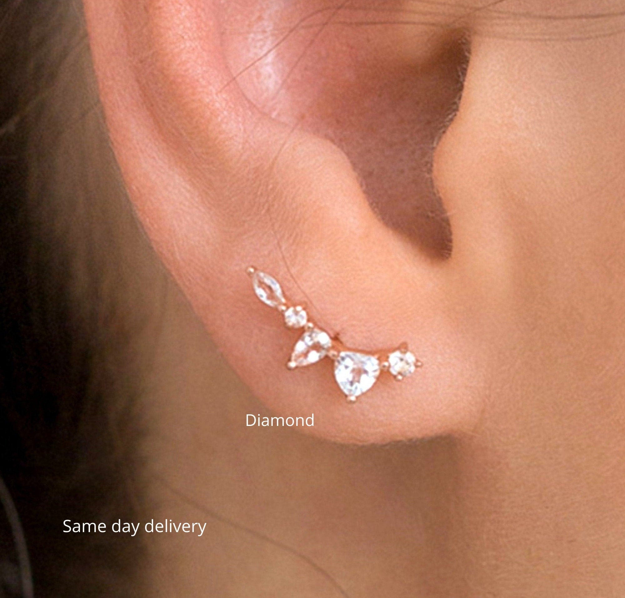 14k solid gold climber earrings diamond stud earrings gift for her diamond ear climber unique stud earrings moissanite small stud earrings
