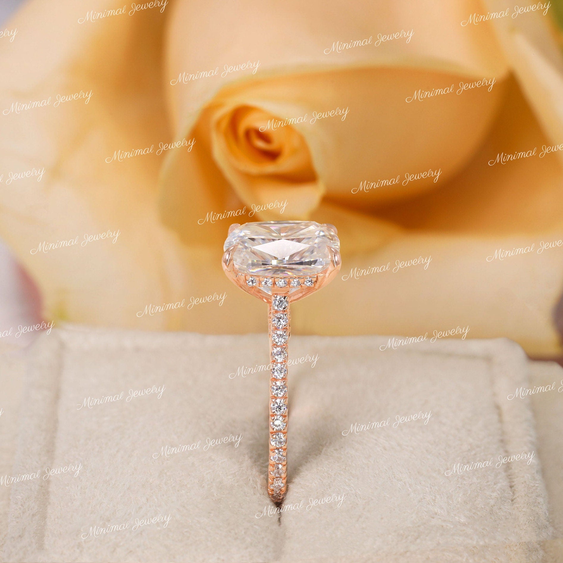 2.5 CT cushion cut moissanite engagement ring,hidden halo,14k Rose gold,pave bridge,elongated cushion,solitaire Cathedral ring,wedding ring