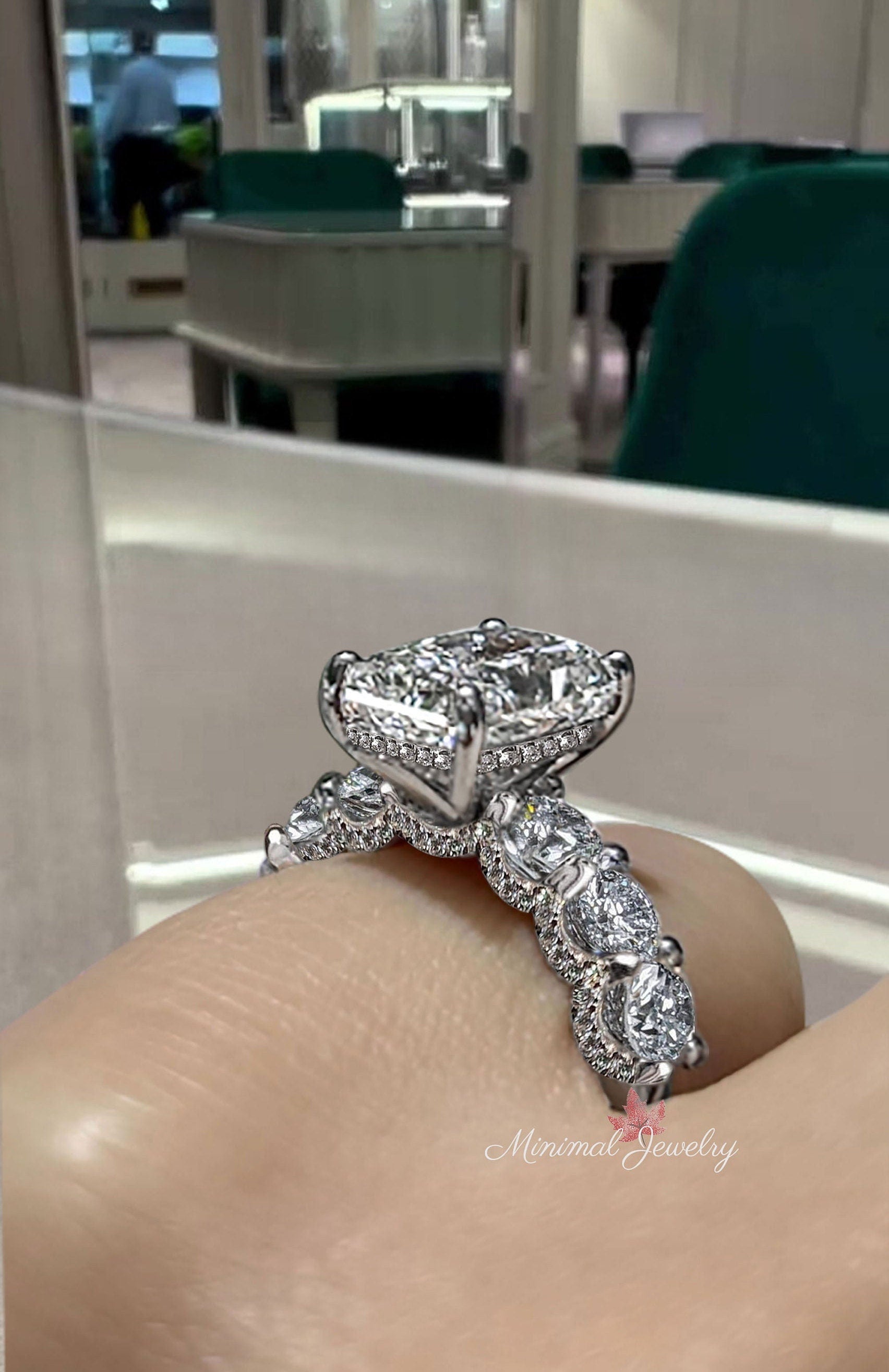 3.5 CT radiant cut engagement ring,crushed ice radiant moissanite engagement ring,hidden halo solitaire,eternity wide band,wedding ring