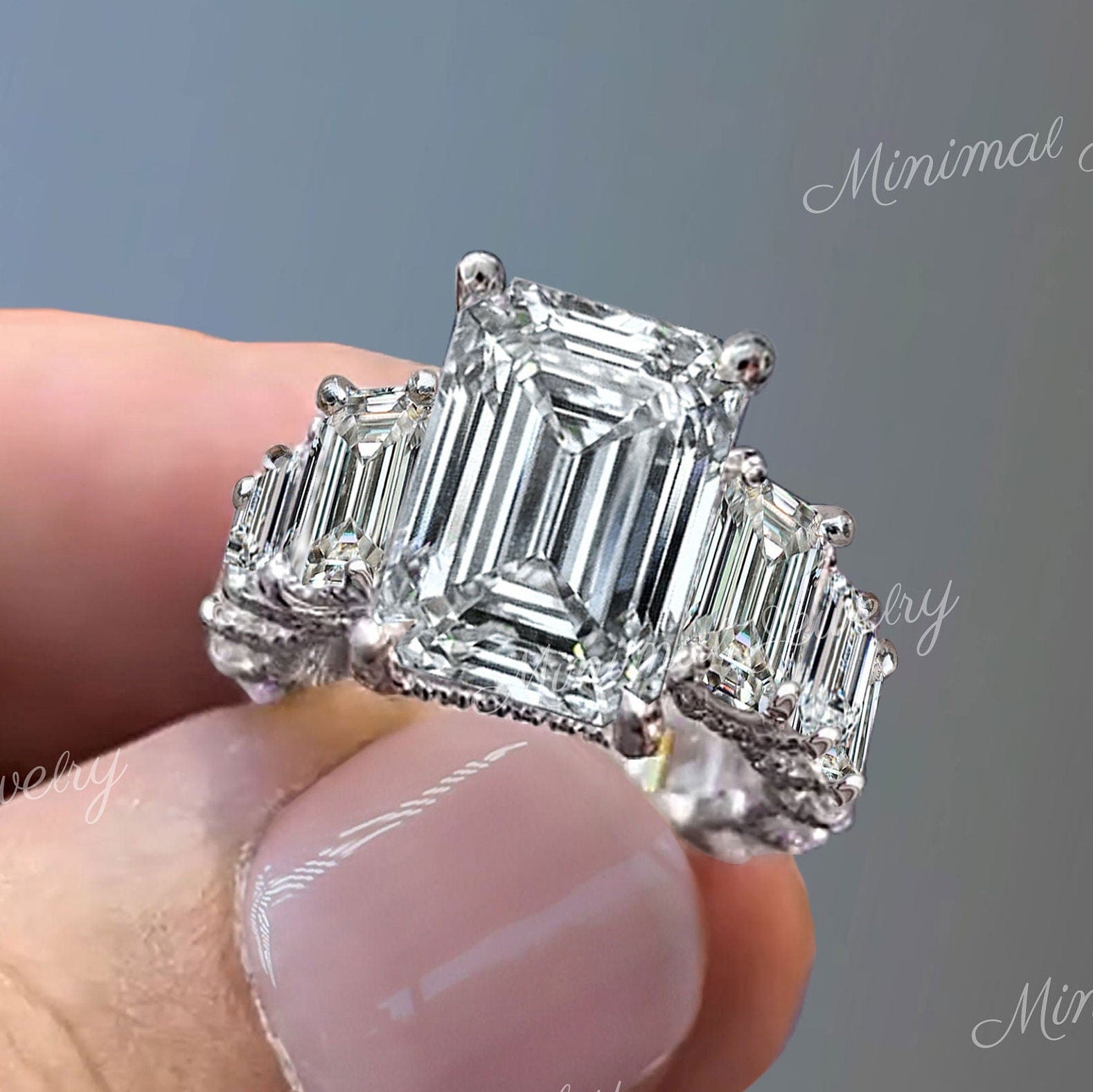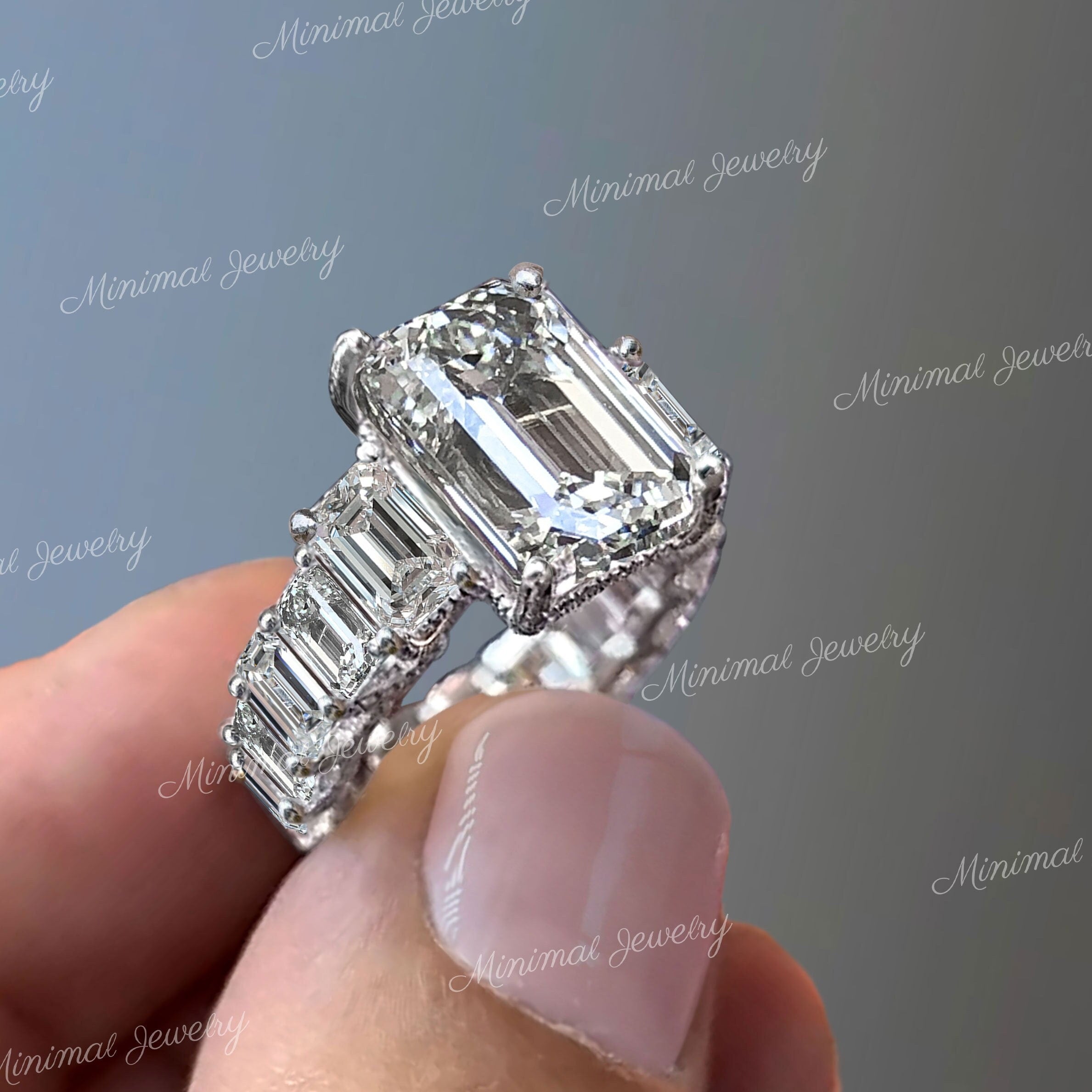 4.4ct emerald cut moissanite ring Three stone engagement ring Hidden Halo Wide Band 14k White Gold Wedding Anniversary Ring for Women