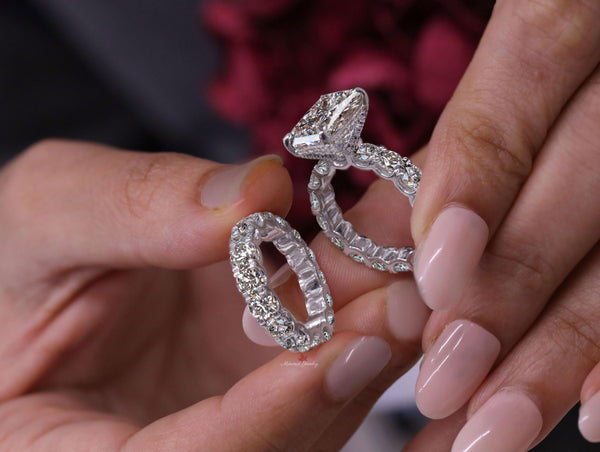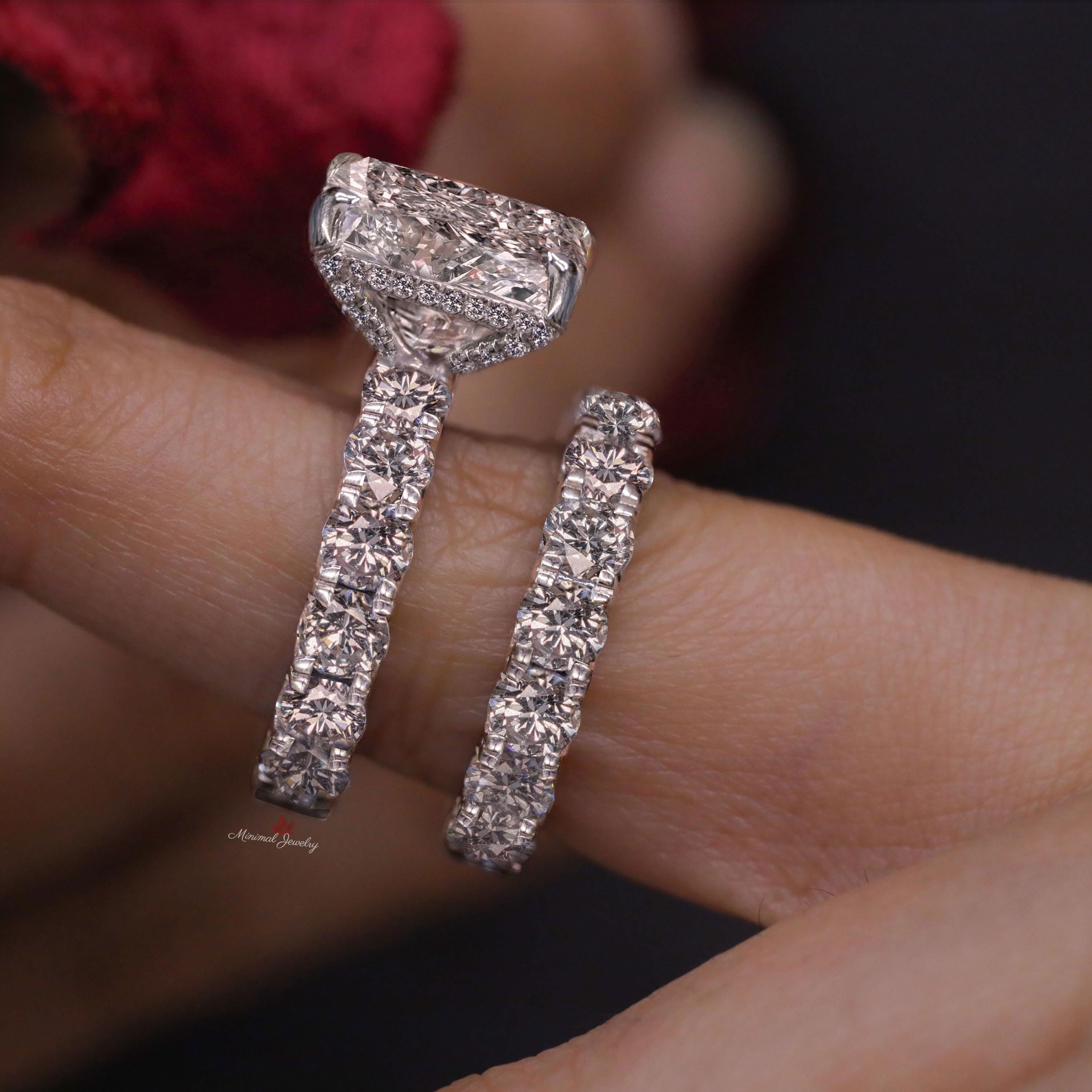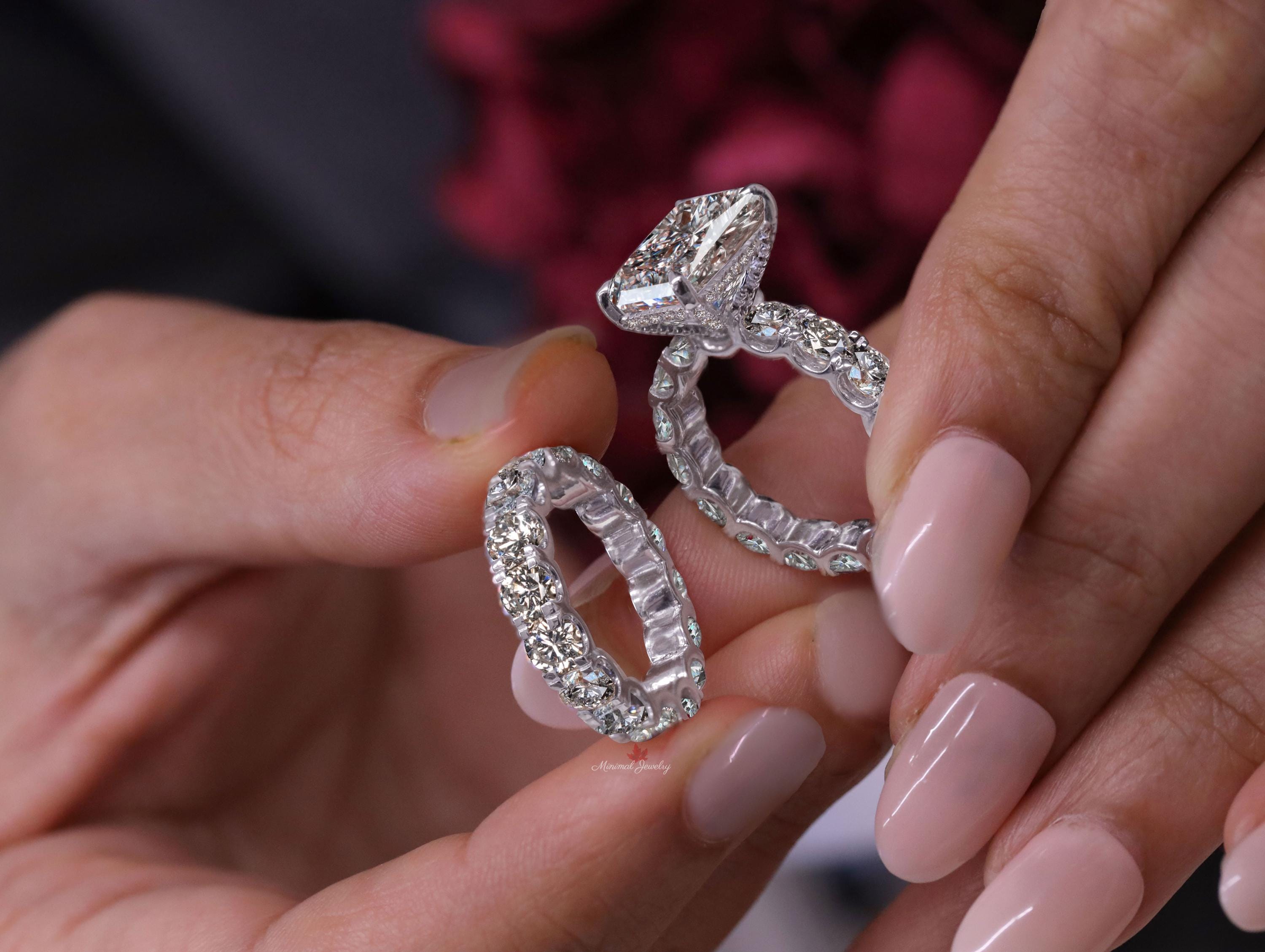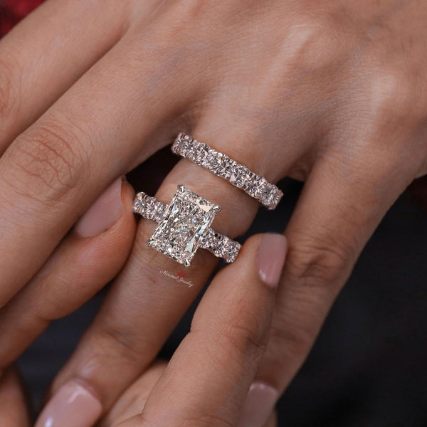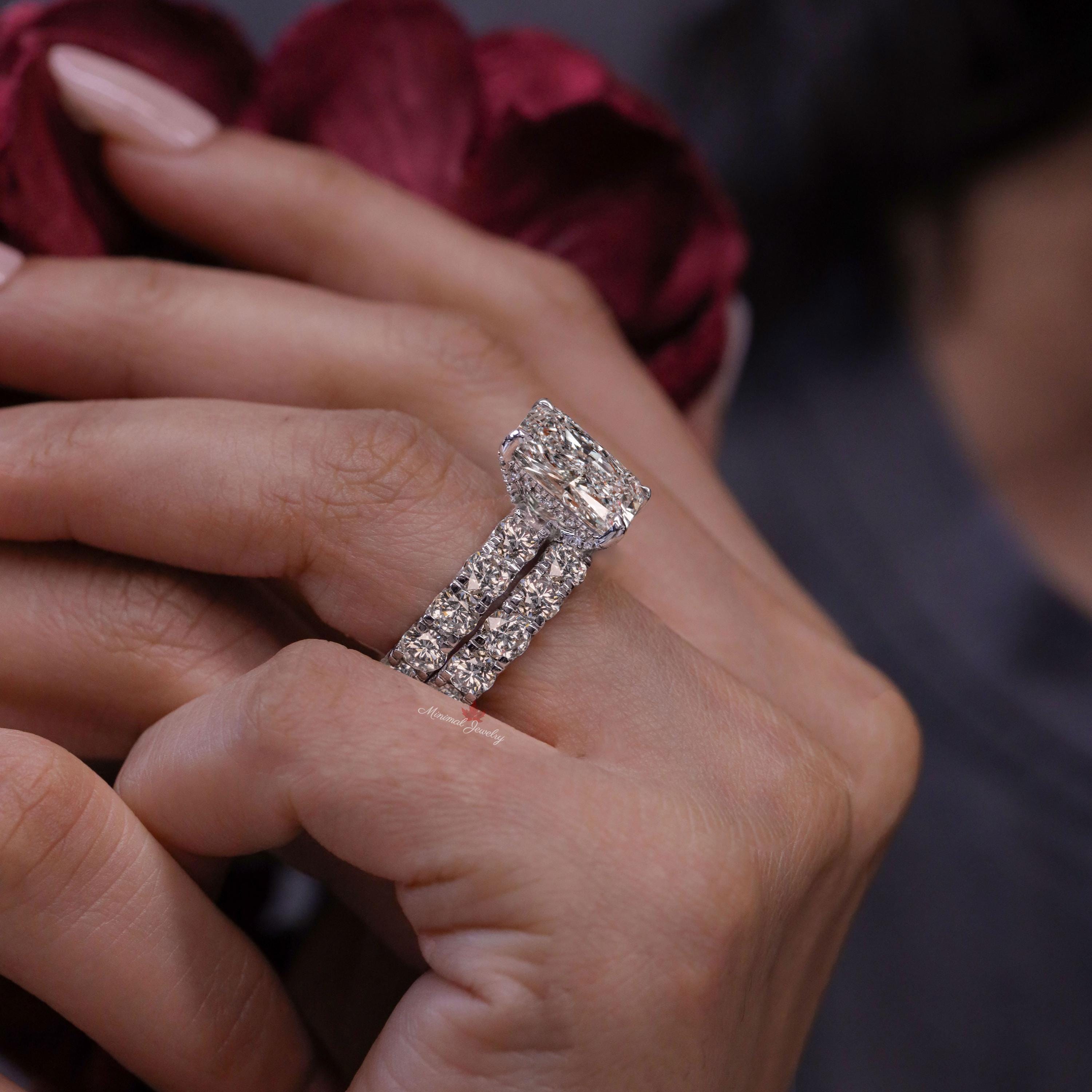 5 CT Radiant cut Engagement ring set,large radiant moissanite solitaire,Celebrity Style art deco,hidden halo,Wide Band wedding ring set