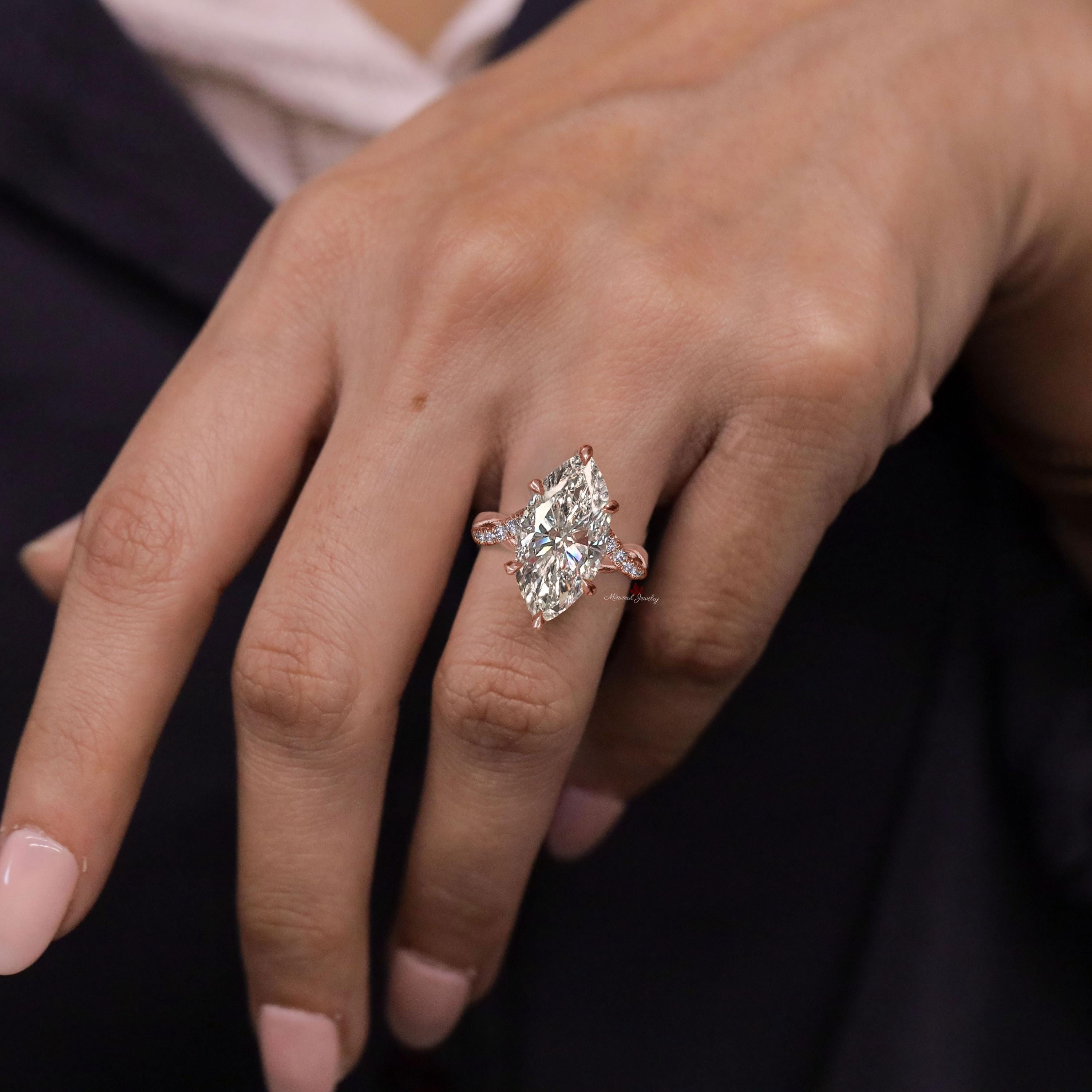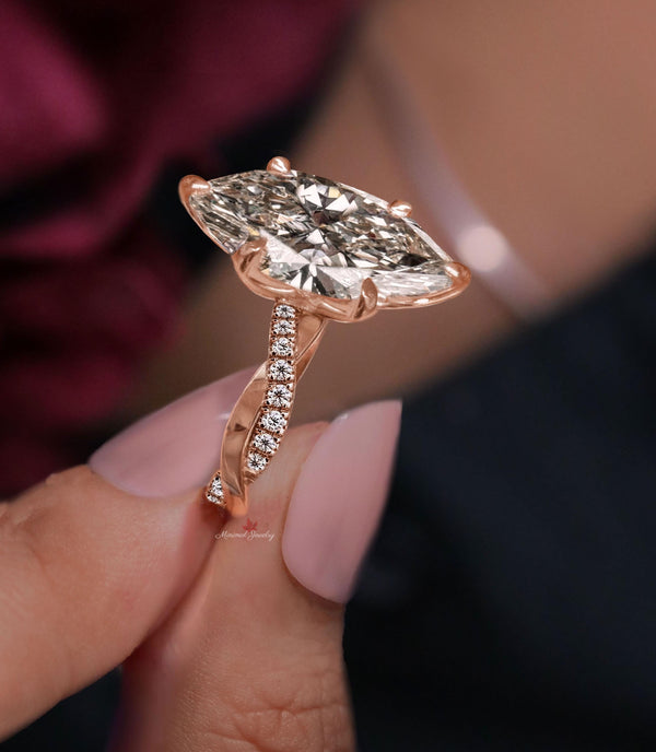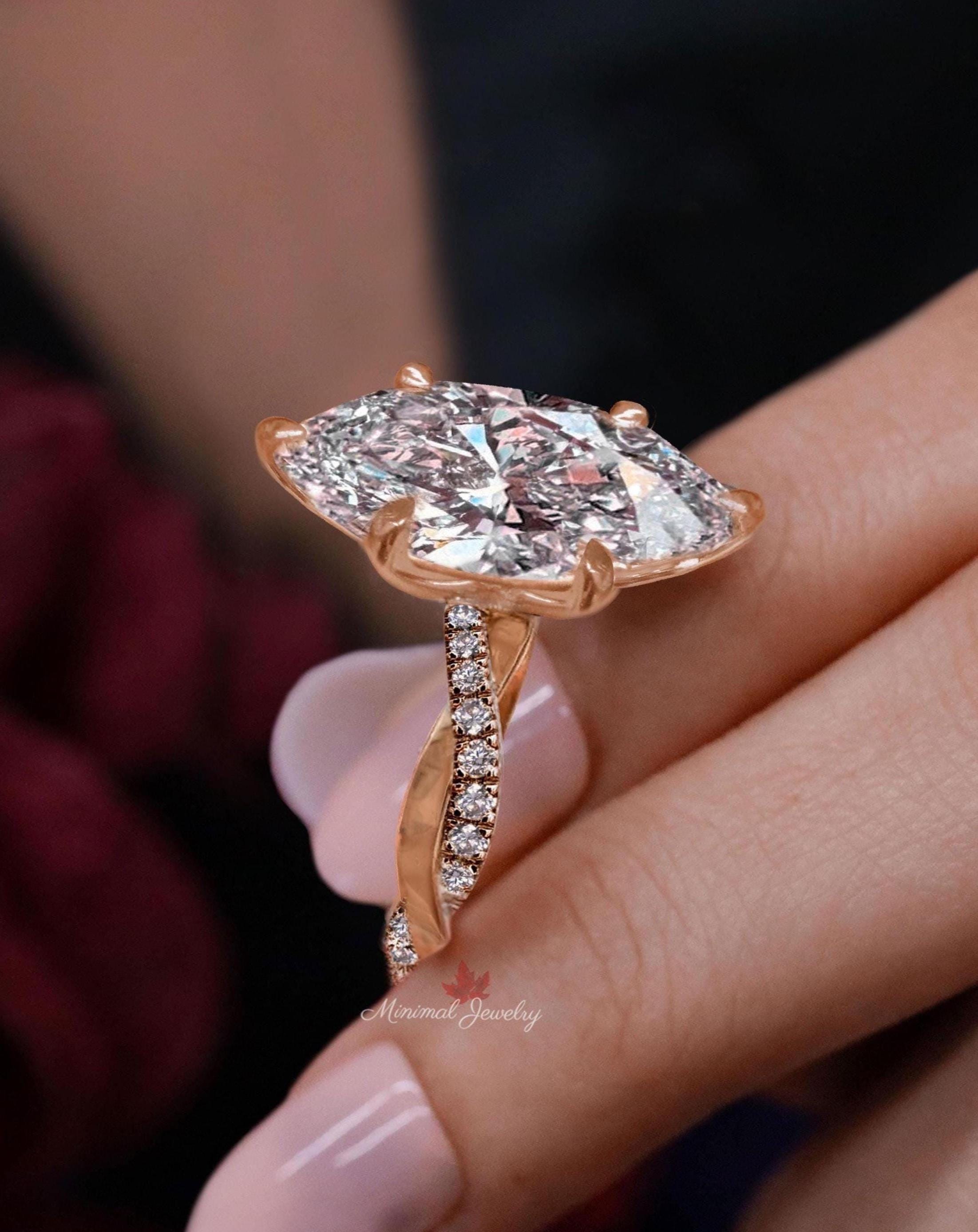 Handmade 5 Carat Marquise Cut Moissanite Ring Hidden Halo Solitaire Infinity Twist Wedding Engagement Ring for Women 14K Yellow Gold → Occasions: Engagement & Wedding DESCRIPTION -------------------- STYLE : Solitaire • Moissanite Details Stone Type : Moissanite - High Quality Main Stone : Marquise Size (mm) : 17*8.5 Carat Weight : 5.0 Band & Halo & Side Stone : Round Size (mm) : 1.4 Carat Weight : 0.27 Stone Total CTW : 5.27 Color : Colorless Clarity : VVS Metal (Solid) : Silver,Gold,Platinum Band Width : 3.7 mm ▶ Wedding Band here : https://bit.ly/Wedding_Band ▶ Go To Shop Sections Here : ▶ Engagement Ring : https://bit.ly/EngagementRings_ ▶ Celebrity Style Ring : https://bit.ly/CelebrityStyleRing ▶ Diamond Hoop Earrings: https://bit.ly/DiamondHoopEarring ▶ Tennis Bracelet : https://bit.ly/TennisBraceletsx ▶ Tennis Necklace : https://bit.ly/TennisNecklaces F O L L O W ∙ U S Instagram : @minimaljewelryandco Facebook : @minimalmoissanitejewelry Pinterest : @minimaljewelryandco YouTube : @minimaljewelryandco Warranty and Service: ------------------------------ • We offer a 1 Year warranty on all our Jewelry. • We also provide paid service after completion of the warranty. • Whats App Contact To Us : +91 878 095 3658 Thank you for visiting our store, see you soon. --------------------------------------------------------------