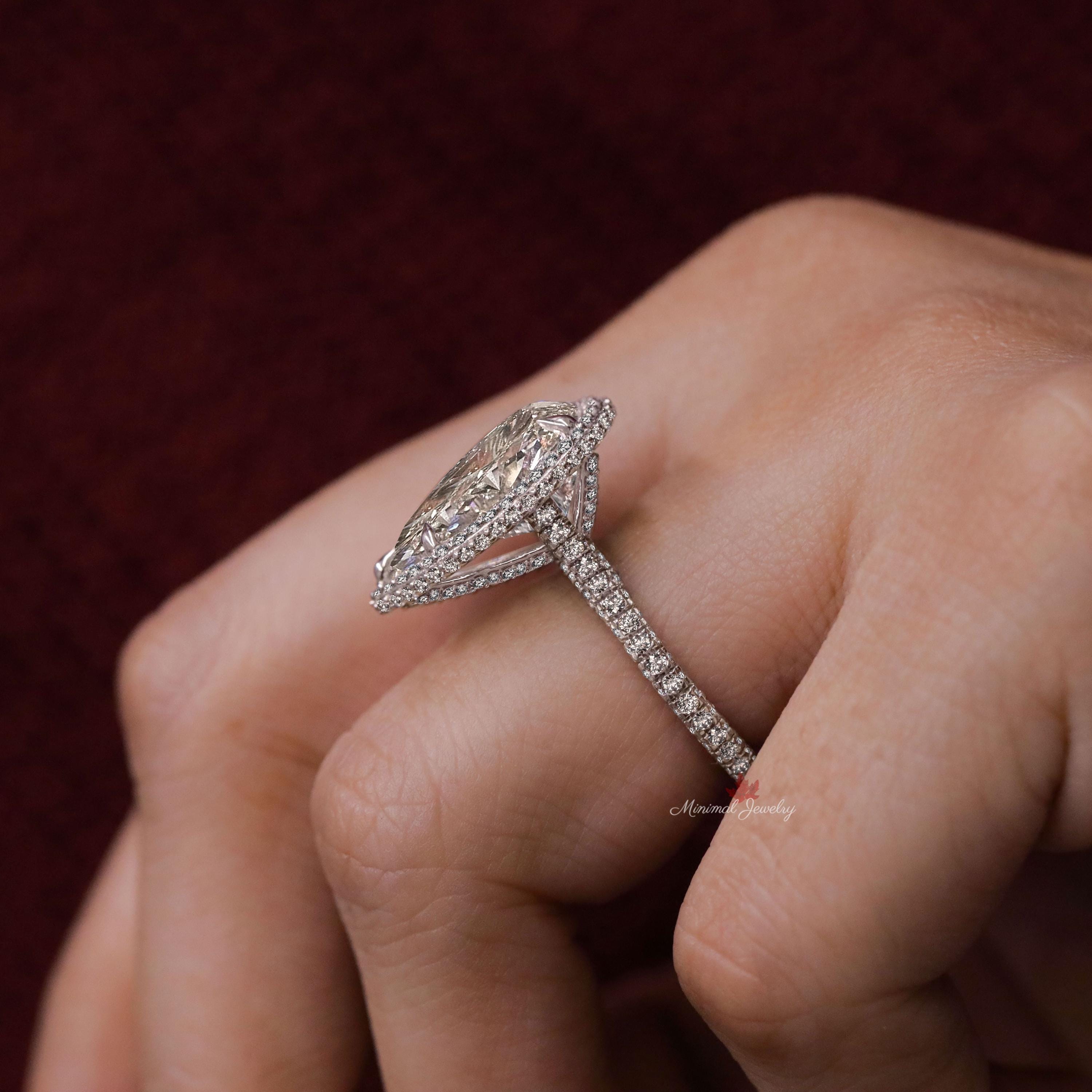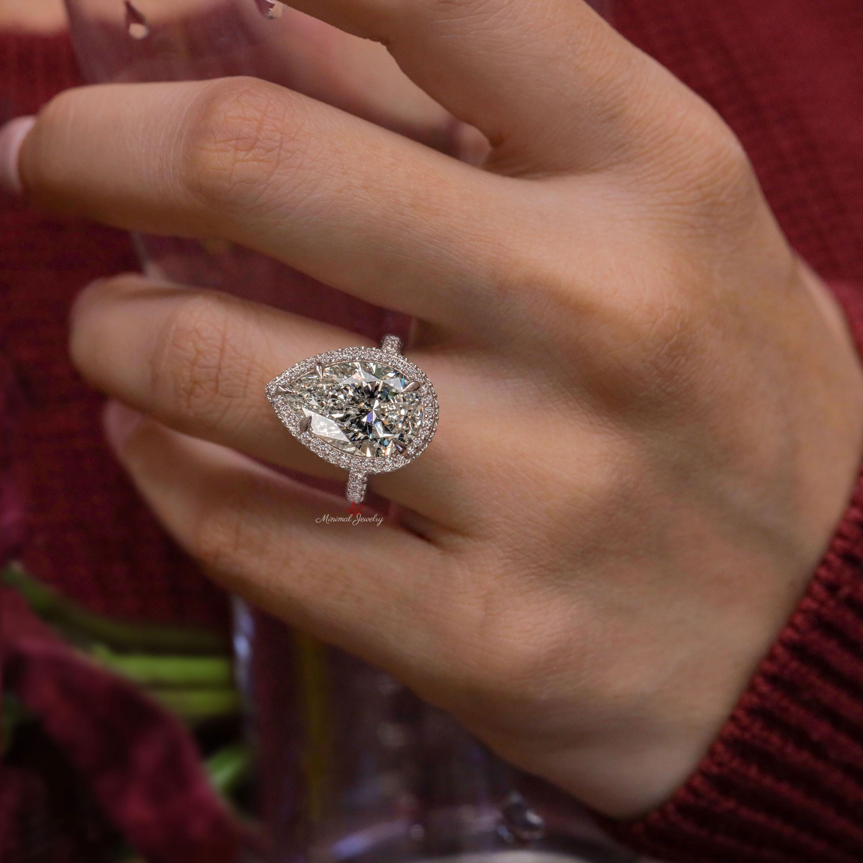 Handmade 6 CT Large Pear moissanite engagement ring,celebrity style pear halo ring,3 row pave Cathedral setting,unique pear shaped ring,pear cocktail wedding ring → Occasions: Engagement & Wedding DESCRIPTION -------------------- STYLE : Halo /Cathedral/3 row pave • Moissanite Details Stone Type : Moissanite - High Quality Main Stone : Pear Size (mm) : 15*10 Carat Weight : 6 Band & Halo & Side Stone : Round Size (mm) : 1.1 to 1.6 Carat Weight : 1.9 Stone Total CTW : 9.9 Color : Colorless Clarity : VVS Metal (Solid) : Silver,Gold,Platinum Band Width : 2 ▶ 𝐖𝐞𝐝𝐝𝐢𝐧𝐠 𝐁𝐚𝐧𝐝 𝐡𝐞𝐫𝐞 : https://bit.ly/Wedding_Band ▶ 𝐆𝐨 𝐓𝐨 𝐒𝐡𝐨𝐩 𝐒𝐞𝐜𝐭𝐢𝐨𝐧𝐬 𝐇𝐞𝐫𝐞 : ▶ Engagement Ring : https://bit.ly/EngagementRings_ ▶ Celebrity Style Ring : https://bit.ly/CelebrityStyleRing ▶ Diamond Hoop Earrings: https://bit.ly/DiamondHoopEarring ▶ Tennis Bracelet : https://bit.ly/TennisBraceletsx ▶ Tennis Necklace : https://bit.ly/TennisNecklaces 𝐅 𝐎 𝐋 𝐋 𝐎 𝐖 ∙ 𝐔 𝐒 Instagram : @minimaljewelryandco Facebook : @minimalmoissanitejewelry Pinterest : @minimaljewelryandco YouTube : @minimaljewelryandco 𝐖𝐚𝐫𝐫𝐚𝐧𝐭𝐲 𝐚𝐧𝐝 𝐒𝐞𝐫𝐯𝐢𝐜𝐞: ------------------------------ • We offer a 1 Year warranty on all our Jewelry. • We also provide paid service after completion of the warranty. 𝐓𝐡𝐚𝐧𝐤 𝐲𝐨𝐮 𝐟𝐨𝐫 𝐯𝐢𝐬𝐢𝐭𝐢𝐧𝐠 𝐨𝐮𝐫 𝐬𝐭𝐨𝐫𝐞, 𝐬𝐞𝐞 𝐲𝐨𝐮 𝐬𝐨𝐨𝐧. --------------------------------------------------------------