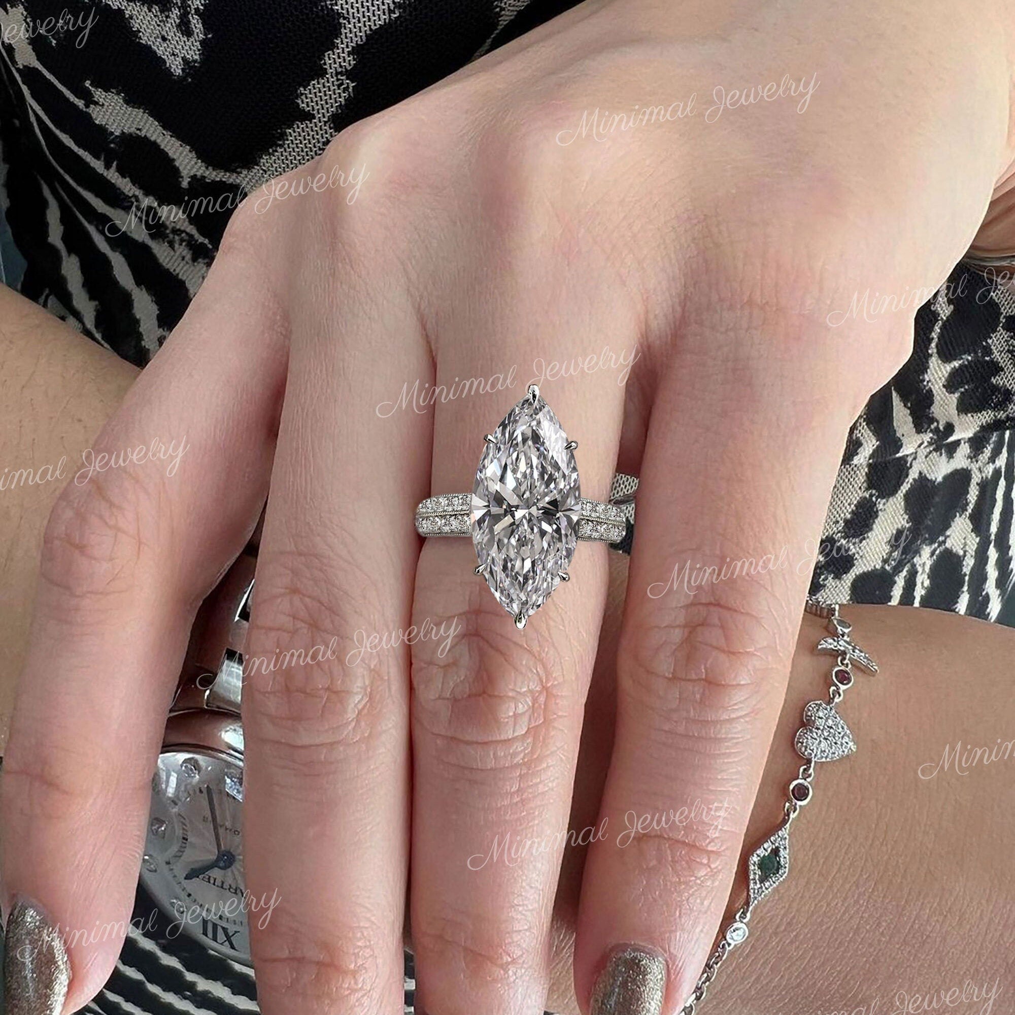 Handmade 7.5 CT large moissanite marquise solitaire Engagement ring Luxury celebrity style big Marquise cut Moissanite Tapered Cathedral shank art deco wedding. → Occasions: Engagement & Wedding DESCRIPTION -------------------- STYLE : Solitaire / Tapered Cathedral • Moissanite Details Stone : Moissanite - High Quality Main Stone : Marquise Size (mm) : 20*10 Carat Weight : 7.5 Band & Halo & Side Stone : Round Size (mm) : 1.1 to 0.8 Carat Weight : 0.5 Stone Total CTW : 8 Color : Colorless Clarity : VVS Metal (Solid) : Silver,Gold,Platinum Band Width : 3 ▶ Wedding Band here : https://bit.ly/Wedding_Band ▶ Go To Shop Sections Here : ▶ Engagement Ring : https://bit.ly/EngagementRings_ ▶ Celebrity Style Ring : https://bit.ly/CelebrityStyleRing ▶ Diamond Hoop Earrings: https://bit.ly/DiamondHoopEarring ▶ Tennis Bracelet : https://bit.ly/TennisBraceletsx ▶ Tennis Necklace : https://bit.ly/TennisNecklaces F O L L O W ∙ U S Instagram : @minimaljewelryandco Facebook : @minimalmoissanitejewelry Pinterest : @minimaljewelryandco YouTube : @minimaljewelryandco Warranty and Service: ------------------------------ • We offer a 1 Year warranty on all our Jewelry. • We also provide paid service after completion of the warranty. • Whats App Contact To Us : +91 878 095 3658 Thank you for visiting our store, see you soon. --------------------------------------------------------------