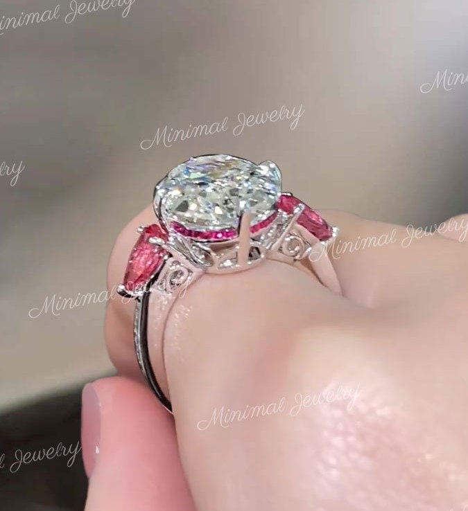 7.5CT Three stone oval engagement ring Large crushed ice oval moissanite ring&pink pear lab diamond hidden halo unique art deco wedding ring