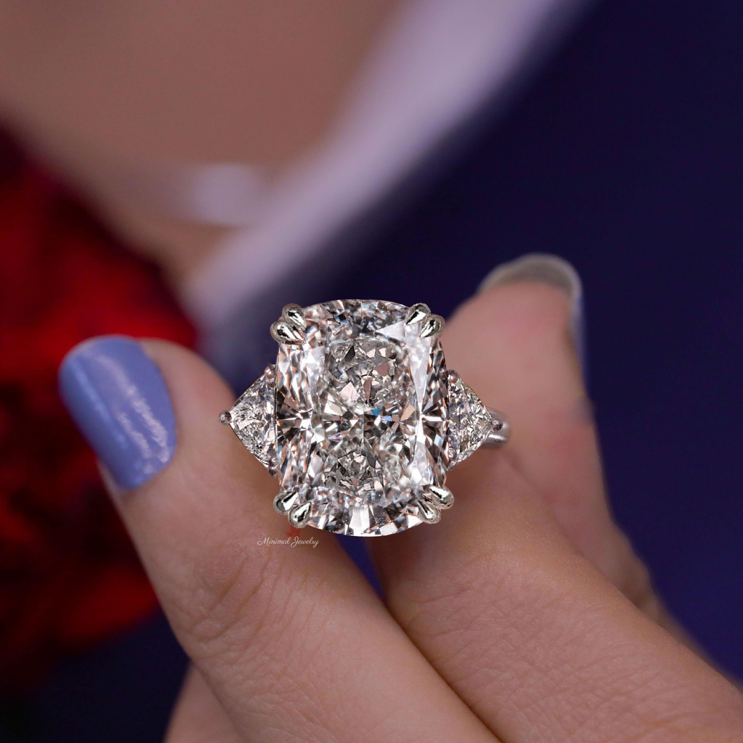 Cushion Cut Moissanite Engagement Ring Side Trillions 18.5CT Elongated Cushion Three Stone Wedding Ring Large Anniversary Statement Ring 14k