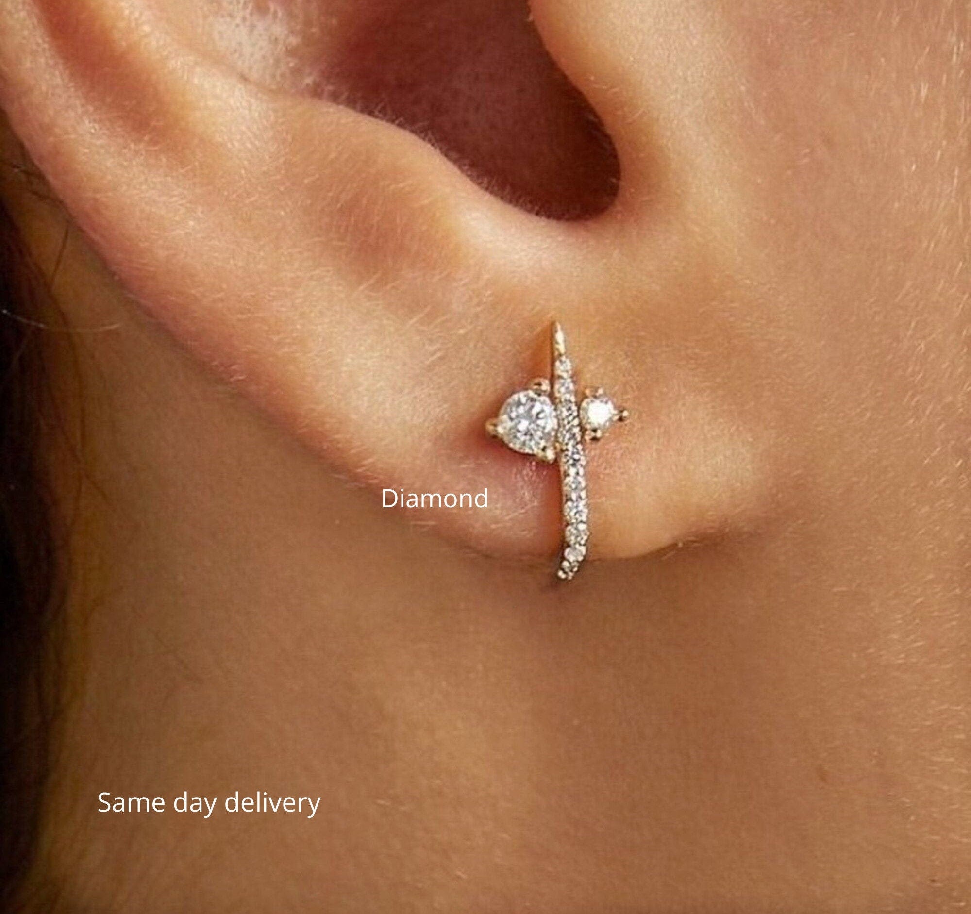 Handmade Real Diamond huggie earrings•14k solid gold huggie earrings•suspender earrings•open half hoop earrings•hook•Natural diamond earrings DESCRIPTION -------------------- This earring Made with 14k solid gold Minimalist style with Diamond G-H Color, Si Purity and high-quality Moissanite (VVS clarity) (Colorless). • Earring Size: → Earring gauge: 20 → Inner Diameter: 7mm→ Outer diameter: 9mm → Inner Diameter: 8mm→ Outer diameter: 10mm • Moissanite Details: → Shape: Round → Measurement: 2.10mm + 1.50 + 0.90 mm → Number of Stone: 2 + 2 + 18 → Total Ctw: 0.18 → Color: Colorless → Clarity: VVS • Diamond Details: → Shape: Round → Measurement: 2.10mm + 1.50 + 0.90 mm → Number of Stone: 2 + 2 + 18 → Total Ctw: 0.23 → Color: G-H color → Clarity: Si • Metal Details: → Metal Type: Gold → Metal Purity: 14k → Metal Color: Yellow Gold, Rose Gold, White Gold ▶ Wedding Band here : https://bit.ly/Wedding_Band ▶ Go To Shop Sections Here : ▶ Engagement Ring : https://bit.ly/EngagementRings_ ▶ Celebrity Style Ring : https://bit.ly/CelebrityStyleRing ▶ Diamond Hoop Earrings: https://bit.ly/DiamondHoopEarring ▶ Tennis Bracelet : https://bit.ly/TennisBraceletsx ▶ Tennis Necklace : https://bit.ly/TennisNecklaces F O L L O W ∙ U S Instagram : @minimaljewelryandco Facebook : @minimalmoissanitejewelry Pinterest : @minimaljewelryandco YouTube : @minimaljewelryandco Warranty and Service: ------------------------------ • We offer a 1 Year warranty on all our Jewelry. • We also provide paid service after completion of the warranty. • Whats App Contact To Us : +91 878 095 3658 Thank you for visiting our store, see you soon. --------------------------------------------------------------