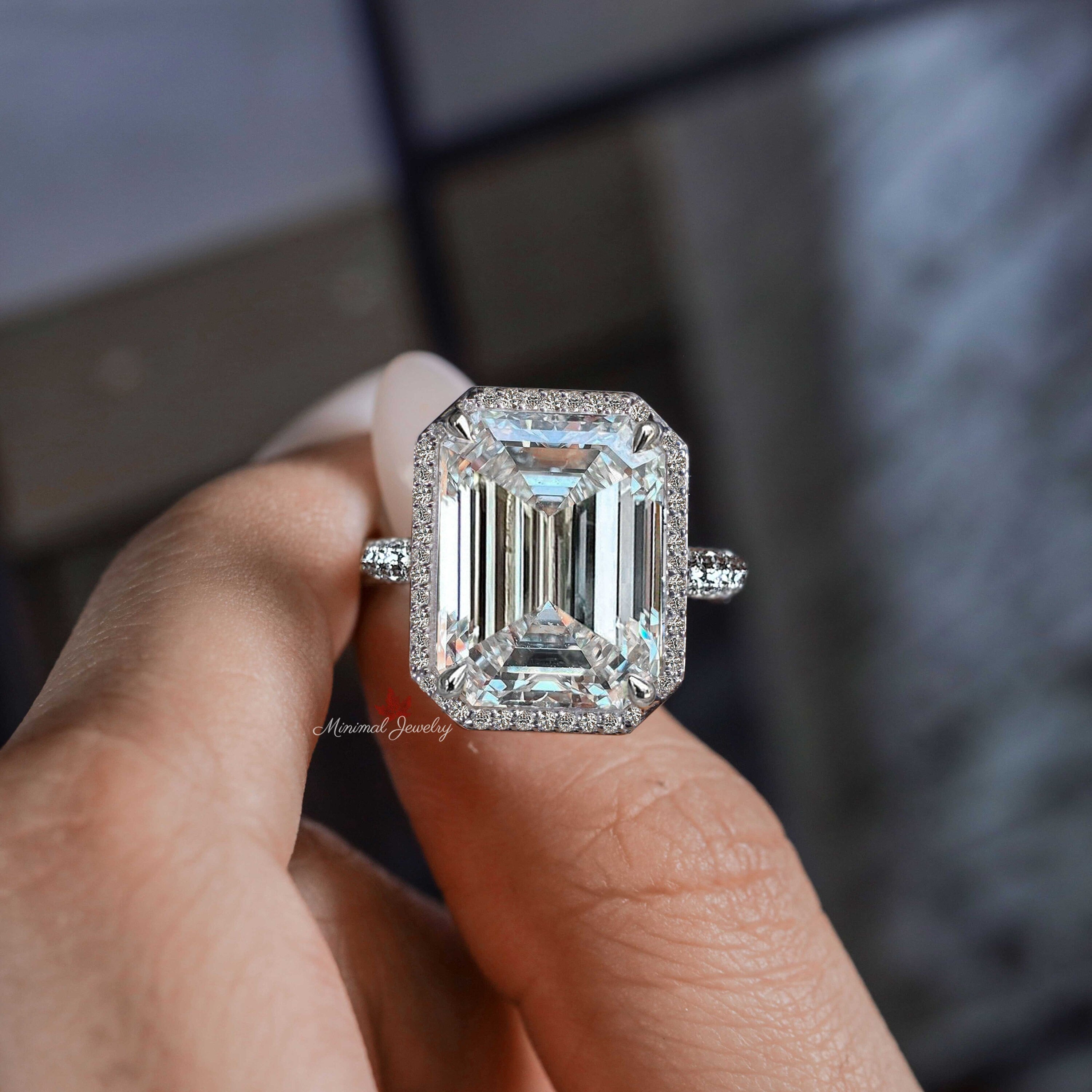 Handmade 13.5 CT Emerald engagement ring large emerald cut halo ring moissanite engagement ring celebrity style wedding ring big diamond cocktail ring → Occasions: Engagement & Wedding DESCRIPTION -------------------- STYLE : Three row pave/solitaire/halo • Moissanite Details Stone Type : Moissanite - High Quality Main Stone : Emerald Size (mm) : 16*12 Carat Weight : 13.5 Band & Halo & Side Stone : Round Size (mm) : 1 to 1.2 Carat Weight : 0.8 Stone Total CTW : 14.3 Color : Colorless Clarity : VVS Metal (Solid) : Silver,Gold,Platinum Band Width : 2 ▶ 𝐖𝐞𝐝𝐝𝐢𝐧𝐠 𝐁𝐚𝐧𝐝 𝐡𝐞𝐫𝐞 : https://bit.ly/Wedding_Band ▶ 𝐆𝐨 𝐓𝐨 𝐒𝐡𝐨𝐩 𝐒𝐞𝐜𝐭𝐢𝐨𝐧𝐬 𝐇𝐞𝐫𝐞 : ▶ Engagement Ring : https://bit.ly/EngagementRings_ ▶ Celebrity Style Ring : https://bit.ly/CelebrityStyleRing ▶ Diamond Hoop Earrings: https://bit.ly/DiamondHoopEarring ▶ Tennis Bracelet : https://bit.ly/TennisBraceletsx ▶ Tennis Necklace : https://bit.ly/TennisNecklaces 𝐅 𝐎 𝐋 𝐋 𝐎 𝐖 ∙ 𝐔 𝐒 Instagram : @minimaljewelryandco Facebook : @minimalmoissanitejewelry Pinterest : @minimaljewelryandco YouTube : @minimaljewelryandco 𝐖𝐚𝐫𝐫𝐚𝐧𝐭𝐲 𝐚𝐧𝐝 𝐒𝐞𝐫𝐯𝐢𝐜𝐞: ------------------------------ • We offer a 1 Year warranty on all our Jewelry. • We also provide paid service after completion of the warranty. 𝐓𝐡𝐚𝐧𝐤 𝐲𝐨𝐮 𝐟𝐨𝐫 𝐯𝐢𝐬𝐢𝐭𝐢𝐧𝐠 𝐨𝐮𝐫 𝐬𝐭𝐨𝐫𝐞, 𝐬𝐞𝐞 𝐲𝐨𝐮 𝐬𝐨𝐨𝐧. --------------------------------------------------------------