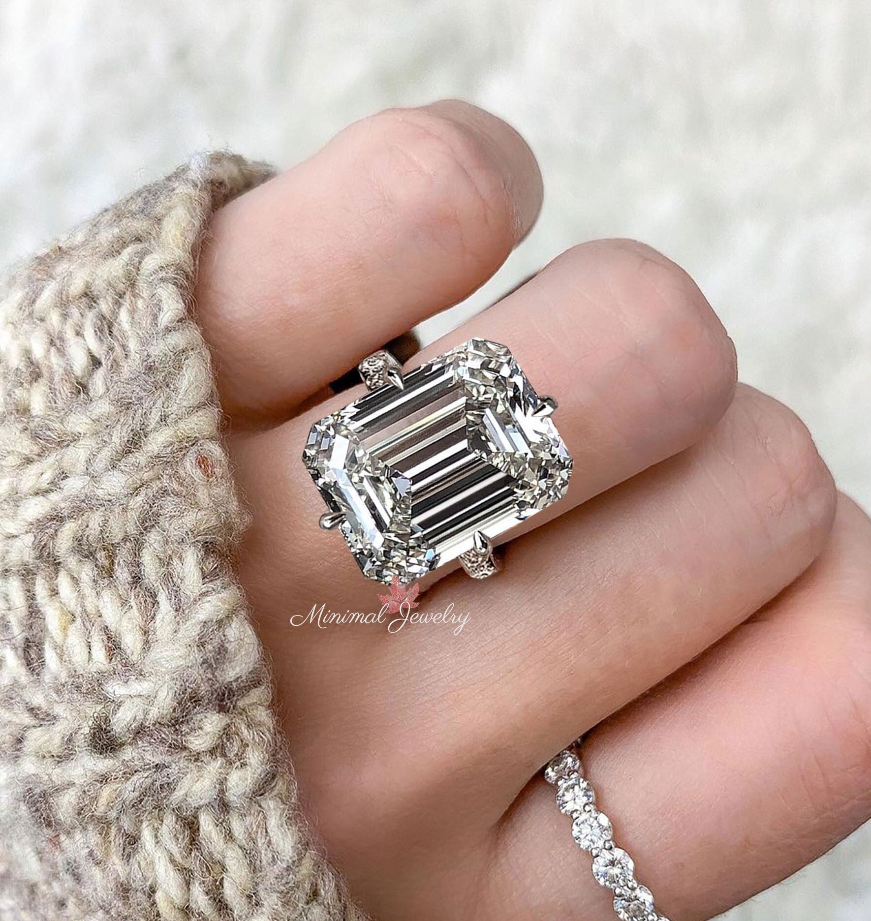 Emerald cut moissanite engagement ring 17 CT unique solitaire large emerald cut moissanite ring Hidden halo claw prong cocktail wedding ring