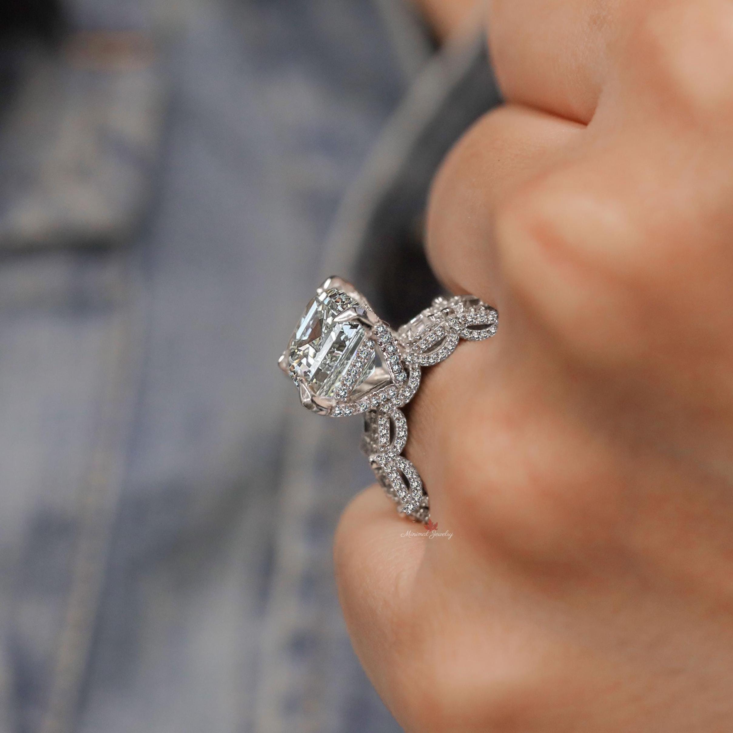 Handmade Celebrity style 11.5 TCW Large Emerald Cut Moissanite Engagement Ring,Hidden Halo,Solitaire eternity Wide Band,luxury Wedding Ring → Occasions: Engagement & Wedding DESCRIPTION -------------------- STYLE : Hidden Halo / Eternity Wide Band • Moissanite Details Stone Type : Moissanite - High Quality Main Stone : Emerald Size (mm) : 14*10 Carat Weight : 8 Band & Halo & Side Stone : Ascher / Round Size (mm) : 3*3 / 1 / 0.9 Carat Weight : 3.5 Stone Total CTW : 11.5 Color : Colorless Clarity : VVS Metal (Solid) : Silver,Gold,Platinum Band Width : 4 ▶ Wedding Band here : https://bit.ly/Wedding_Band ▶ Go To Shop Sections Here : ▶ Engagement Ring : https://bit.ly/EngagementRings_ ▶ Celebrity Style Ring : https://bit.ly/CelebrityStyleRing ▶ Diamond Hoop Earrings: https://bit.ly/DiamondHoopEarring ▶ Tennis Bracelet : https://bit.ly/TennisBraceletsx ▶ Tennis Necklace : https://bit.ly/TennisNecklaces F O L L O W ∙ U S Instagram : @minimaljewelryandco Facebook : @minimalmoissanitejewelry Pinterest : @minimaljewelryandco YouTube : @minimaljewelryandco Warranty and Service: ------------------------------ • We offer a 1 Year warranty on all our Jewelry. • We also provide paid service after completion of the warranty. • Whats App Contact To Us : +91 878 095 3658 Thank you for visiting our store, see you soon. --------------------------------------------------------------