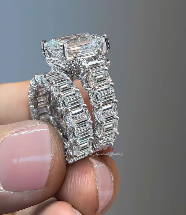 Emerald Cut Moissanite Engagement Ring set 15.1TCW Three stone moissanite bridal set hidden halo wide eternity band wedding anniversary ring