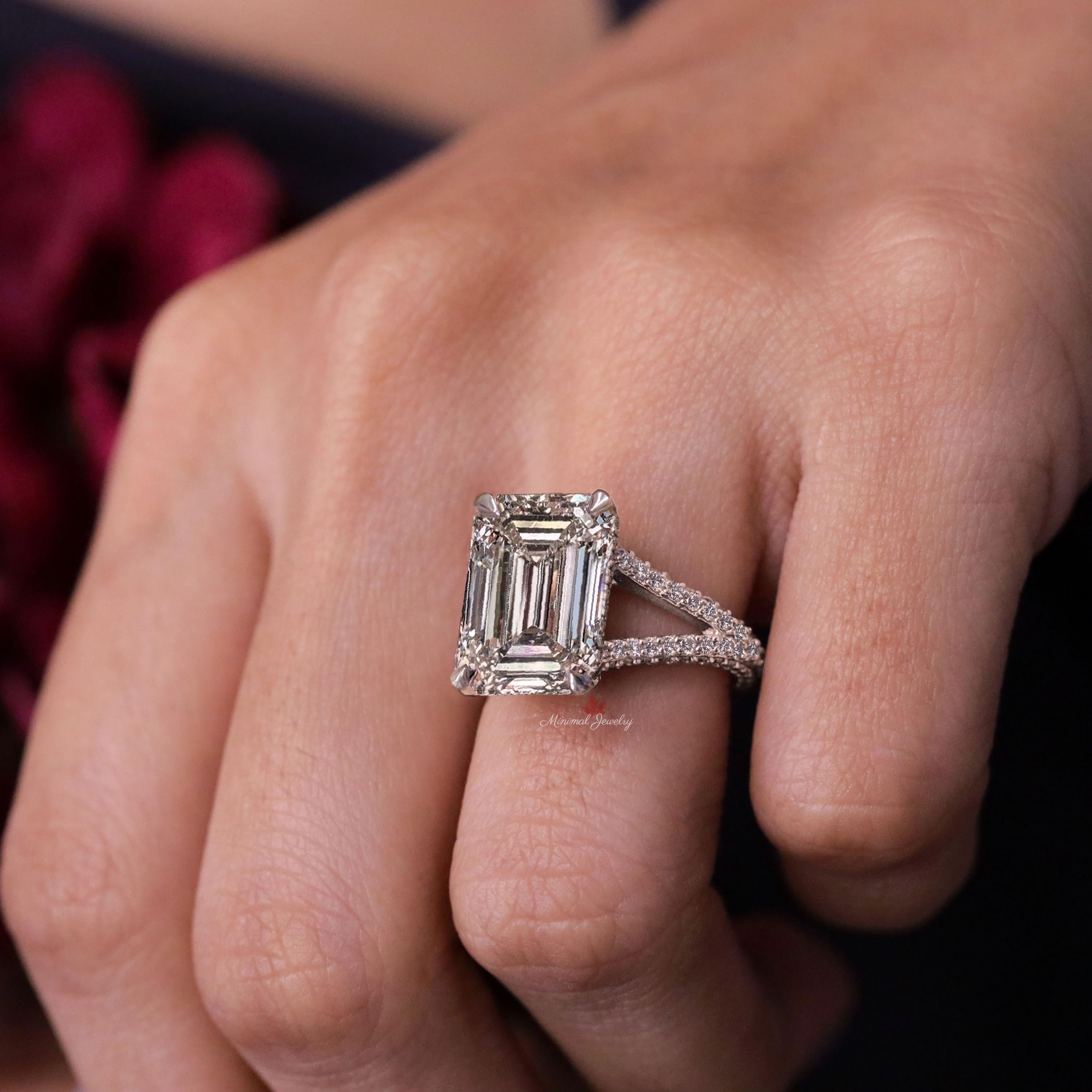 Handmad 8CT Emerald Cut Moissanite Engagement Ring Hidden Halo Split Shank Wedding Ring Statement Cocktail Anniversary Ring for Women → Occasions: Engagement & Wedding DESCRIPTION -------------------- STYLE : Split shank/ hidden halo • Moissanite Details Stone Type : Moissanite - High Quality Main Stone : Emerald Size (mm) : 14*10 Carat Weight : 8.0 Band & Halo & Side Stone : Round Size (mm) : 1.7 to 1 Carat Weight : 1.23 Stone Total CTW : 9.23 Color : Colorless Clarity : VVS Metal (Solid) : Silver,Gold,Platinum Band Width : 2.5 mm ▶ 𝐖𝐞𝐝𝐝𝐢𝐧𝐠 𝐁𝐚𝐧𝐝 𝐡𝐞𝐫𝐞 : https://bit.ly/Wedding_Band ▶ 𝐆𝐨 𝐓𝐨 𝐒𝐡𝐨𝐩 𝐒𝐞𝐜𝐭𝐢𝐨𝐧𝐬 𝐇𝐞𝐫𝐞 : ▶ Engagement Ring : https://bit.ly/EngagementRings_ ▶ Celebrity Style Ring : https://bit.ly/CelebrityStyleRing ▶ Diamond Hoop Earrings: https://bit.ly/DiamondHoopEarring ▶ Tennis Bracelet : https://bit.ly/TennisBraceletsx ▶ Tennis Necklace : https://bit.ly/TennisNecklaces 𝐅 𝐎 𝐋 𝐋 𝐎 𝐖 ∙ 𝐔 𝐒 Instagram : @minimaljewelryandco Facebook : @minimalmoissanitejewelry Pinterest : @minimaljewelryandco YouTube : @minimaljewelryandco 𝐖𝐚𝐫𝐫𝐚𝐧𝐭𝐲 𝐚𝐧𝐝 𝐒𝐞𝐫𝐯𝐢𝐜𝐞: ------------------------------ • We offer a 1 Year warranty on all our Jewelry. • We also provide paid service after completion of the warranty. 𝐓𝐡𝐚𝐧𝐤 𝐲𝐨𝐮 𝐟𝐨𝐫 𝐯𝐢𝐬𝐢𝐭𝐢𝐧𝐠 𝐨𝐮𝐫 𝐬𝐭𝐨𝐫𝐞, 𝐬𝐞𝐞 𝐲𝐨𝐮 𝐬𝐨𝐨𝐧. --------------------------------------------------------------