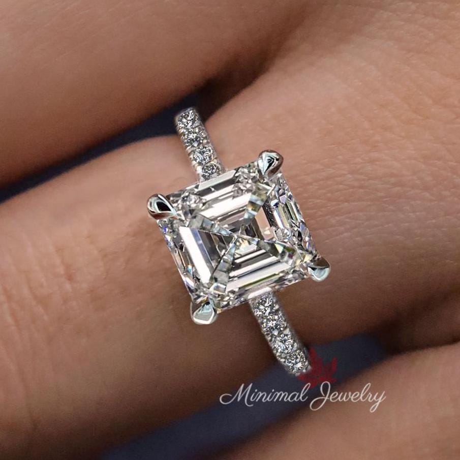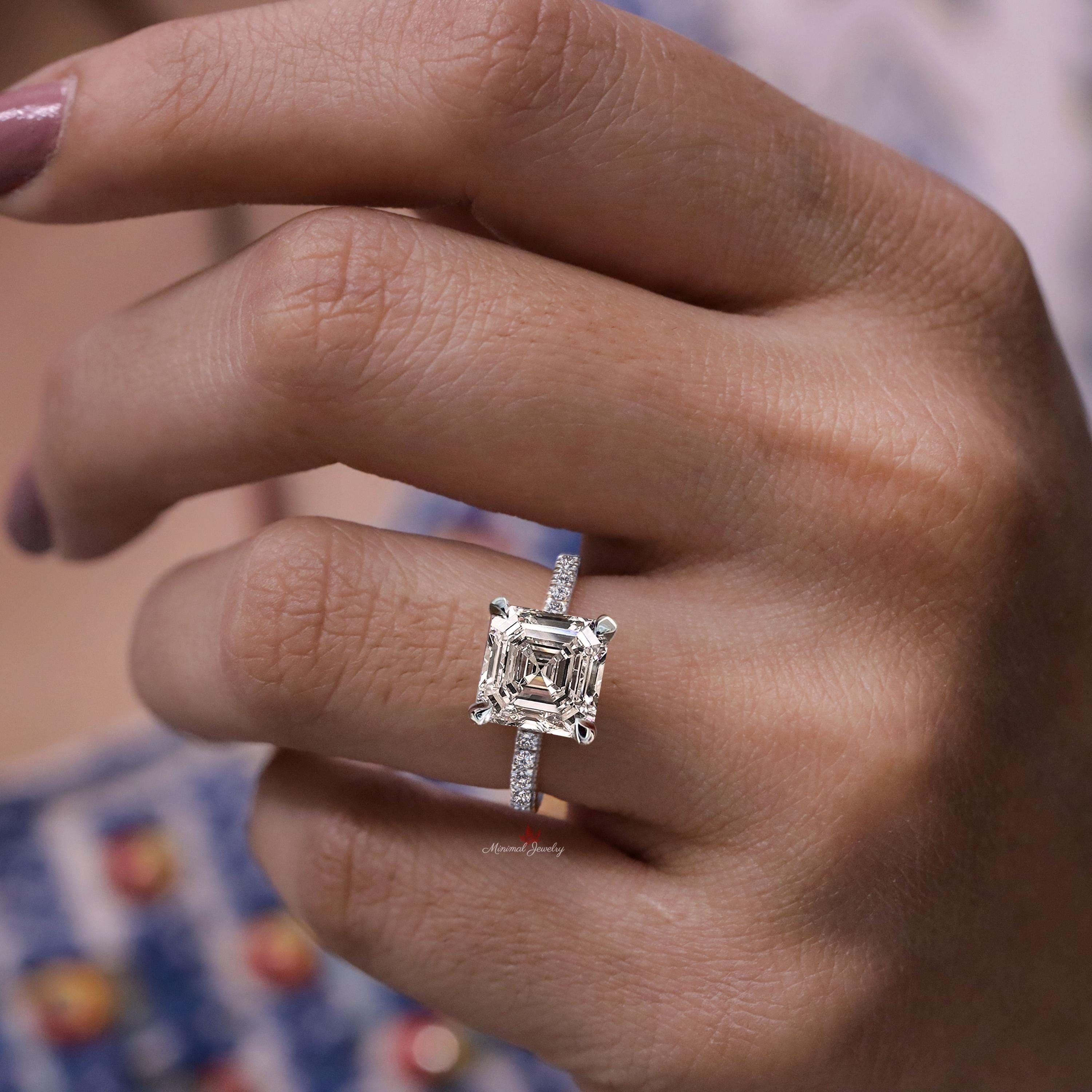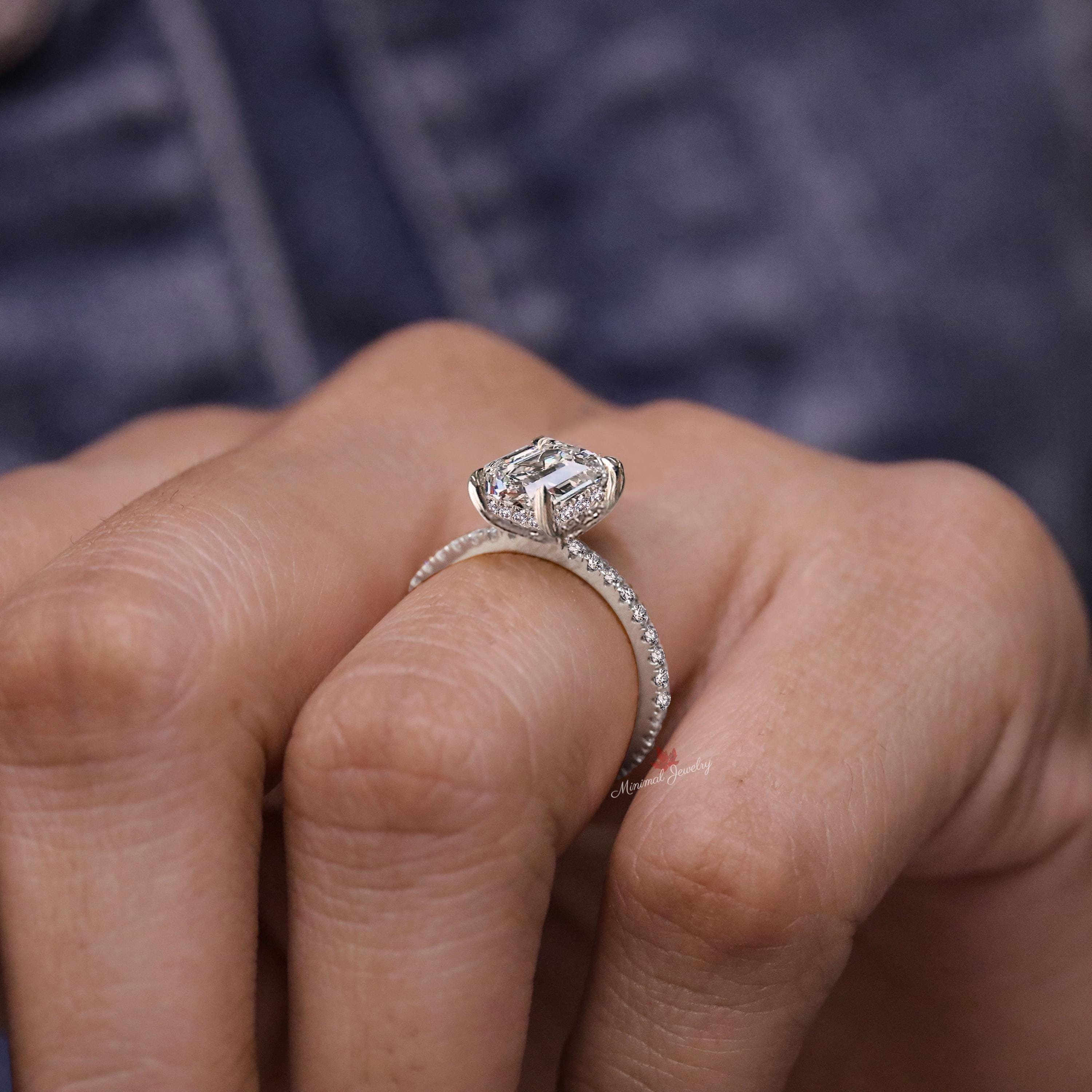Lab Grown Diamond Engagement Ring IGI Certified 2 ct Asscher Cut Lab Diamond wedding ring Hidden halo 14k Gold 4 prong solitaire Thin Band