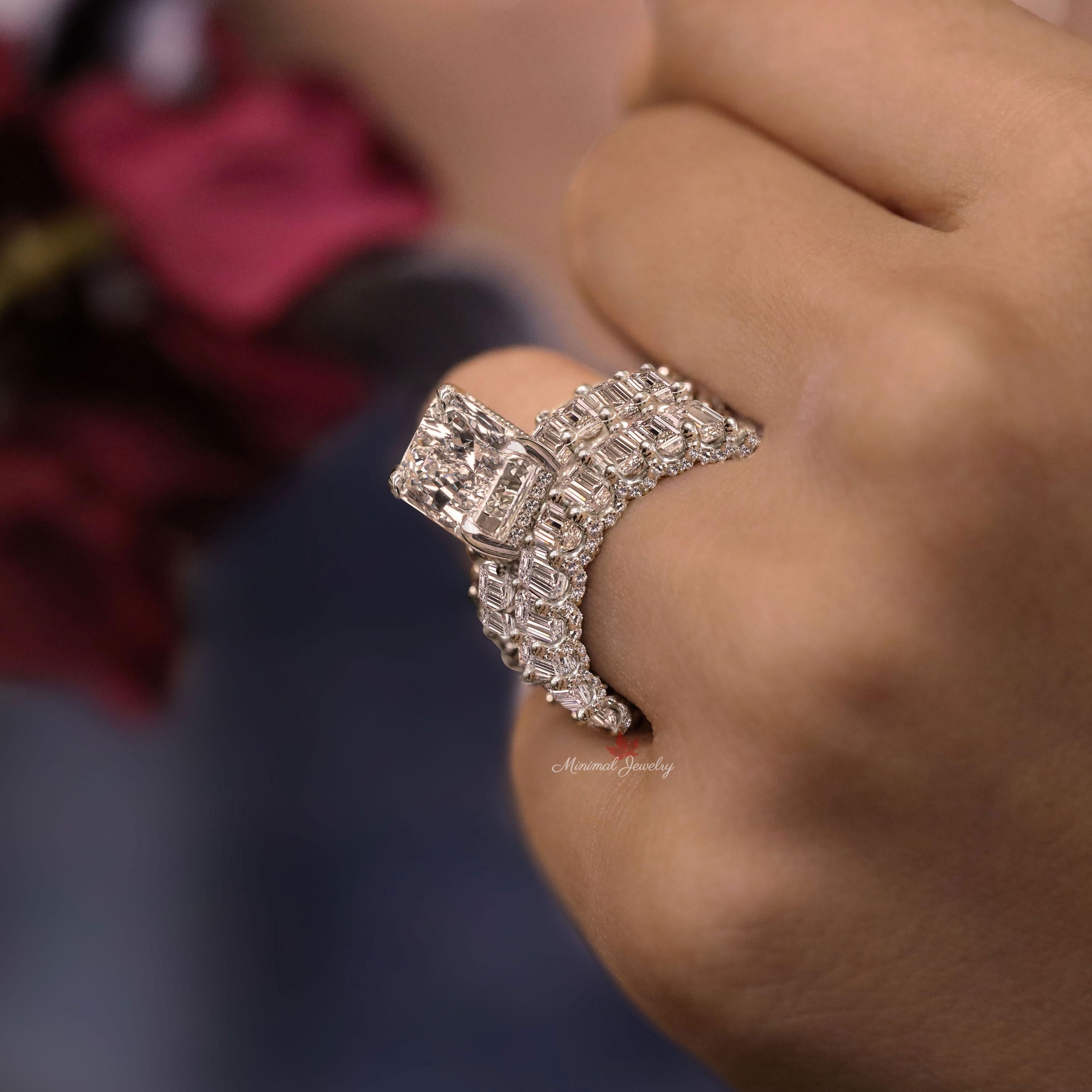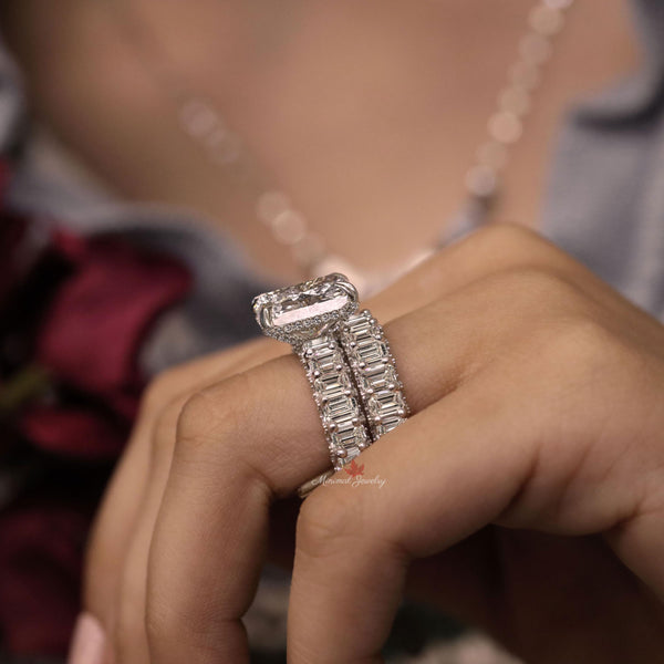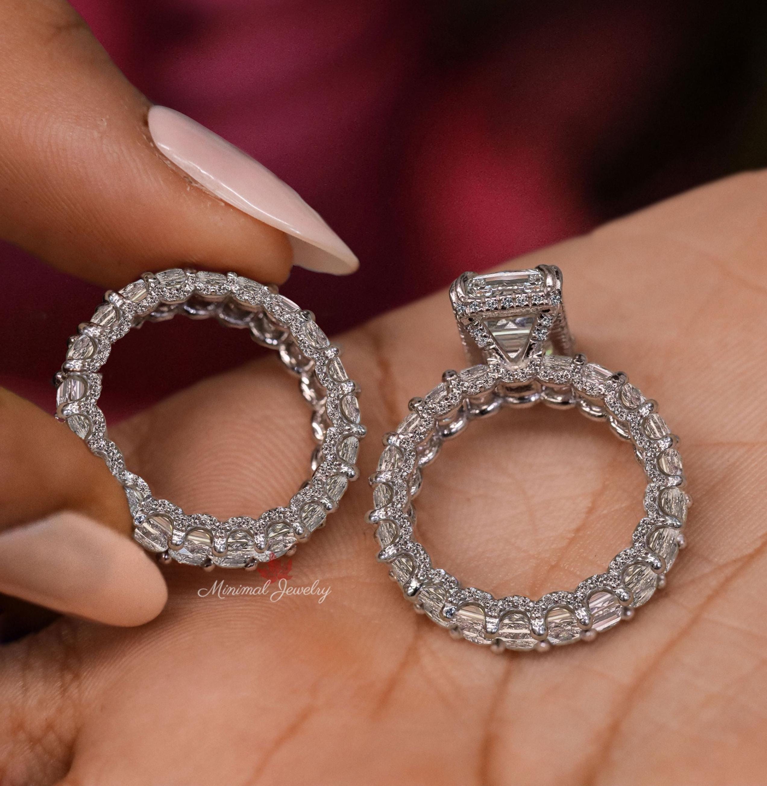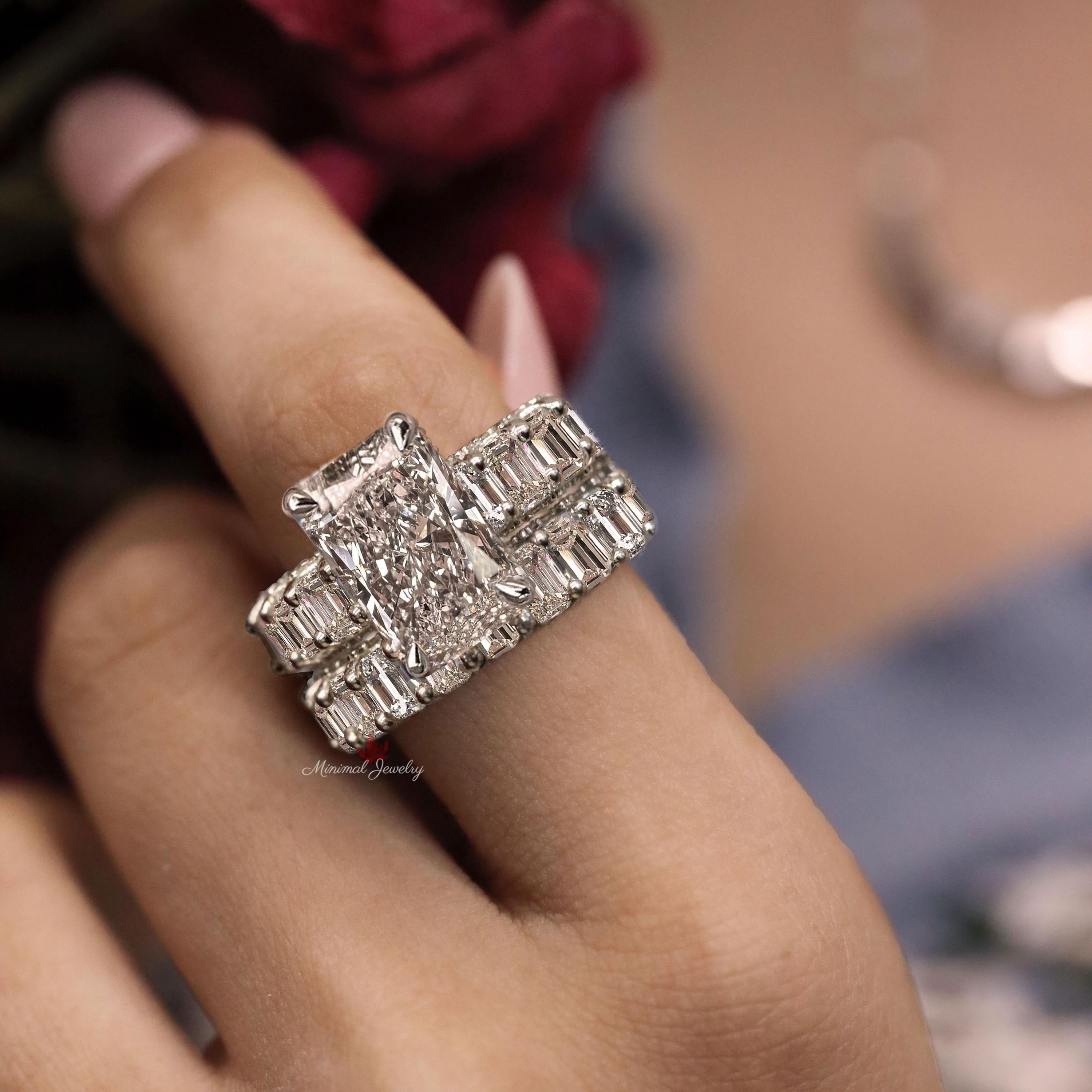 Lab grown diamond Radiant cut engagement ring set 5.5 CT IGI Certified Solitaire diamond Hidden Halo Eternity band Wedding Anniversary Ring
