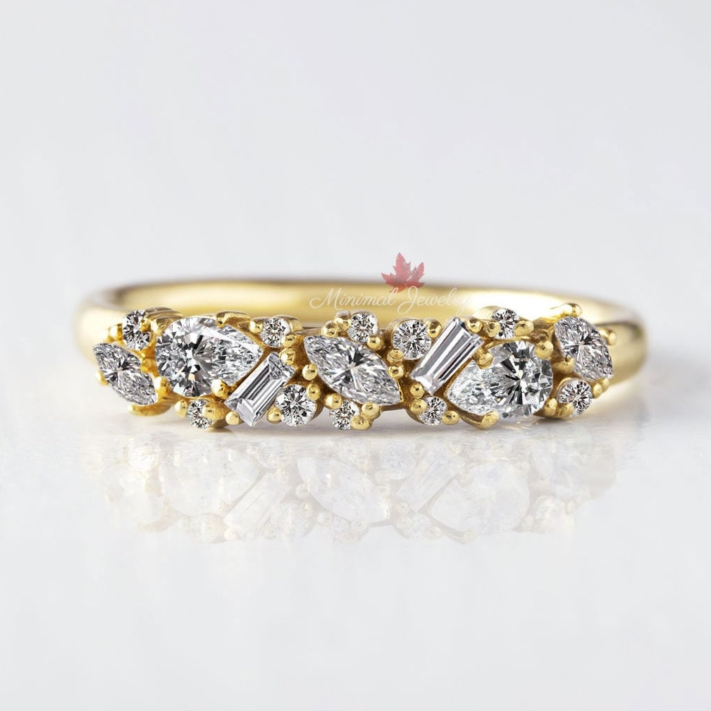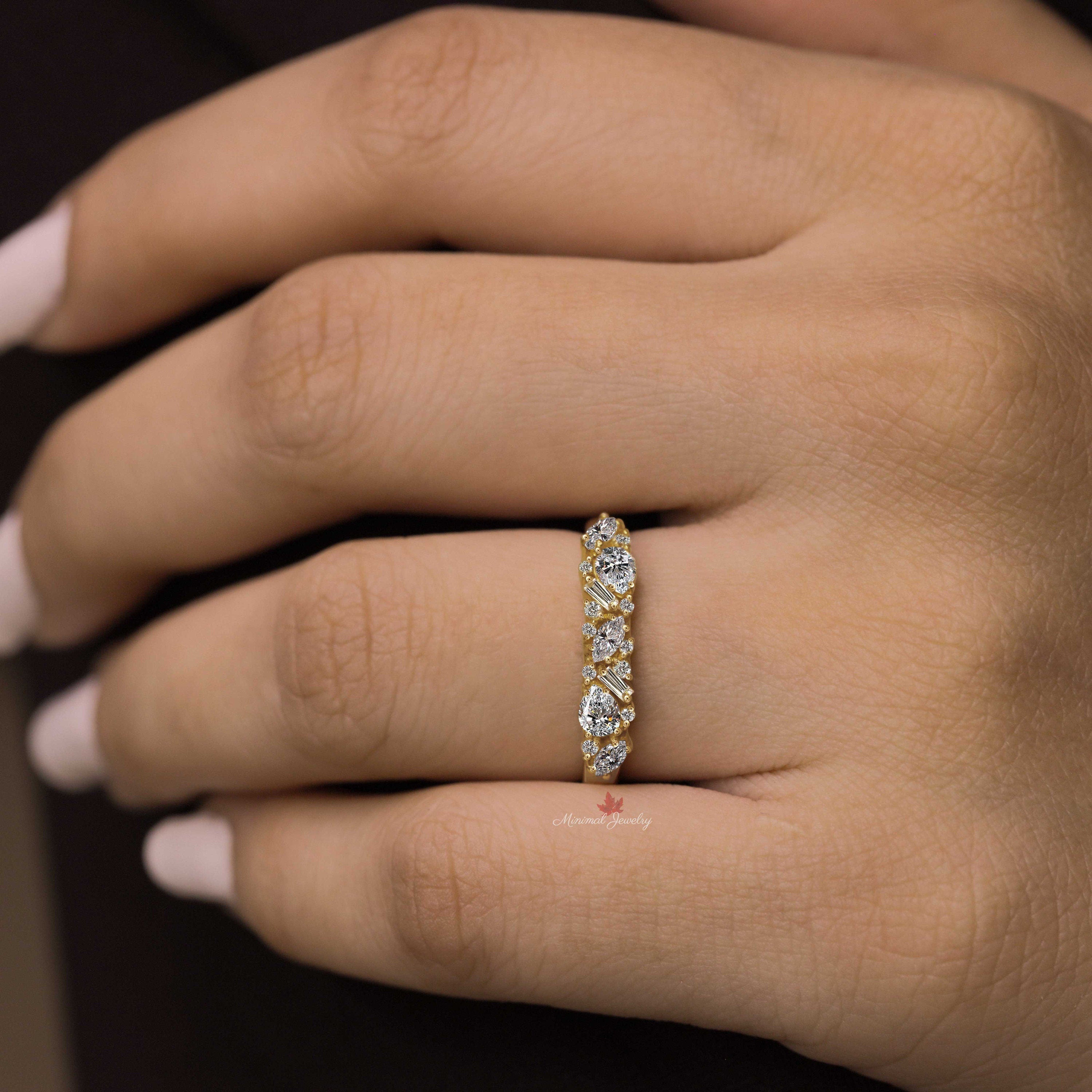 Marquise Moissanite Cluster Wedding Band baguette cluster ring 14k Gold Thick Anniversary Ring for women