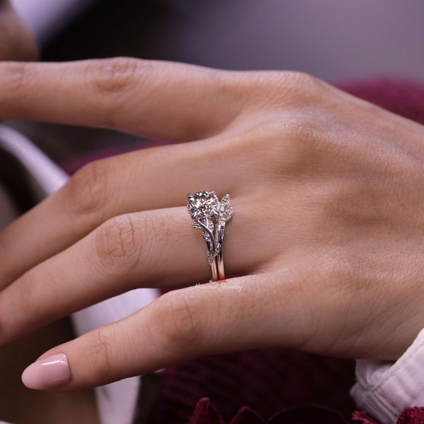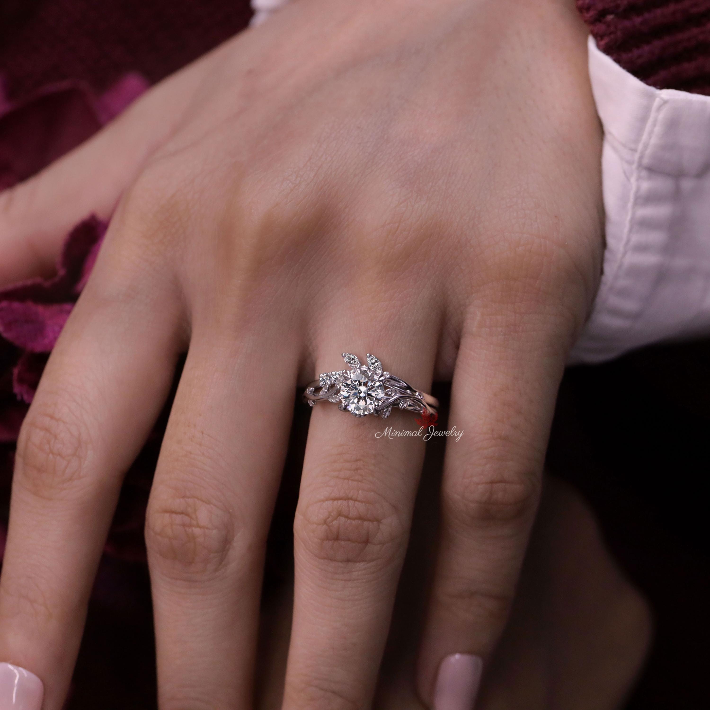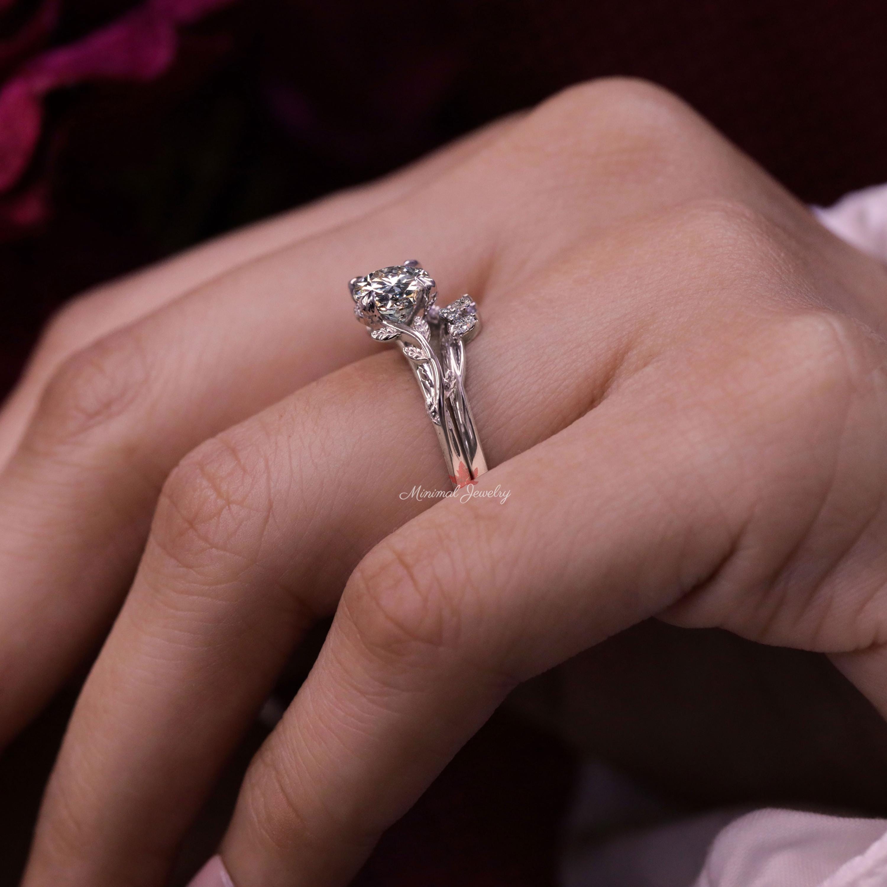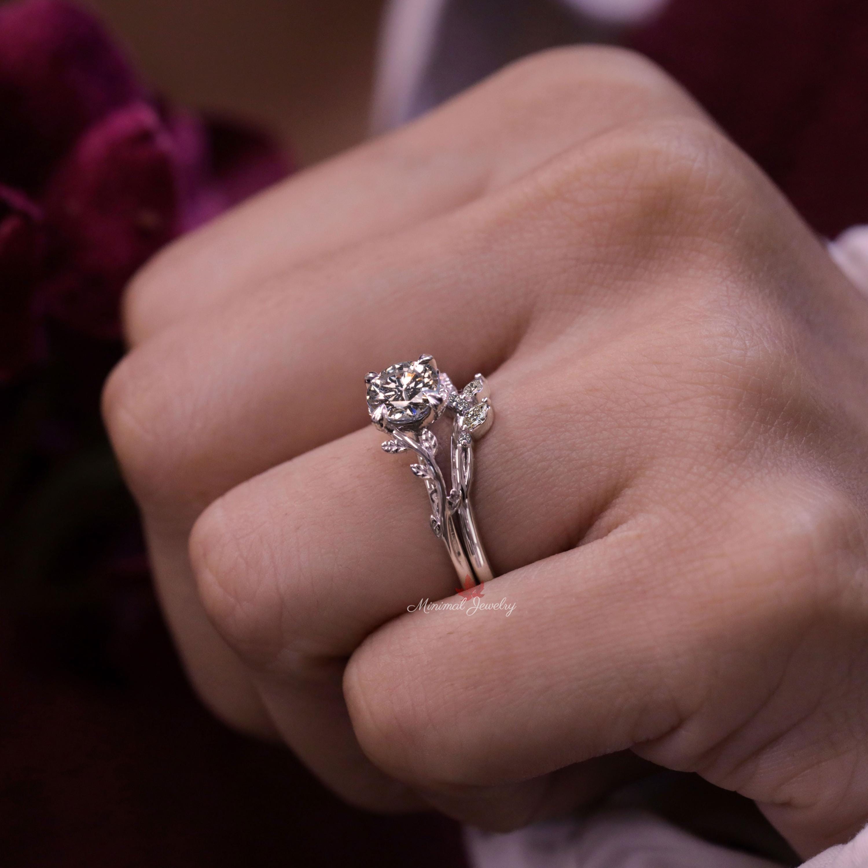 Nature inspired engagement ring set platinum 1 carat moissanite flower leaf engagement ring bridal wedding ring set women promise ring her
