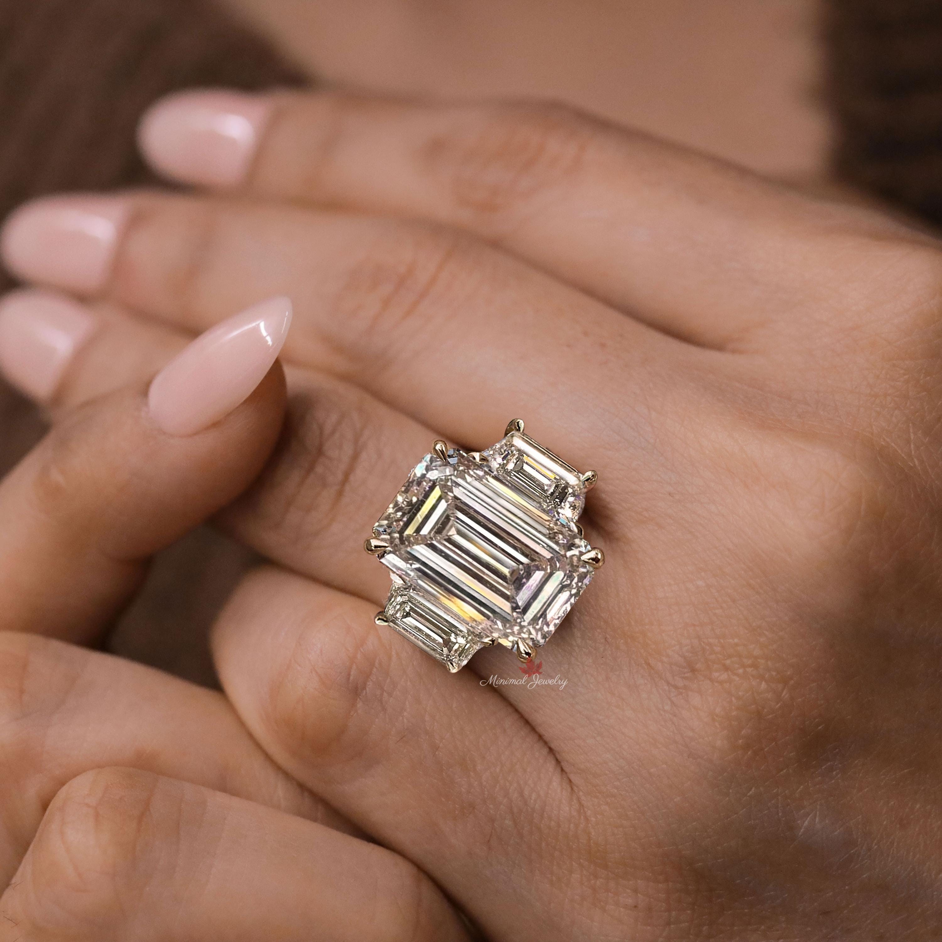 Handmade 12.3 TCW Three stone emerald cut moissanite engagement ring14k white gold,unique trilogy ring,celebrity style wedding ring anniversary ring gift for women → Occasions: Engagement & Wedding DESCRIPTION -------------------- STYLE : Three stone • Moissanite Details Stone Type : Moissanite - High Quality Main Stone : Emerald Size (mm) : 15*10 Carat Weight : 9 Band & Halo & Side Stone : Emerald Size (mm) : 5*9 Carat Weight : 3.33 Stone Total CTW : 12.3 Color : Colorless Clarity : VVS Metal (Solid) : Silver,Gold,Platinum Band Width : 2 ▶ 𝐖𝐞𝐝𝐝𝐢𝐧𝐠 𝐁𝐚𝐧𝐝 𝐡𝐞𝐫𝐞 : https://bit.ly/Wedding_Band ▶ 𝐆𝐨 𝐓𝐨 𝐒𝐡𝐨𝐩 𝐒𝐞𝐜𝐭𝐢𝐨𝐧𝐬 𝐇𝐞𝐫𝐞 : ▶ Engagement Ring : https://bit.ly/EngagementRings_ ▶ Celebrity Style Ring : https://bit.ly/CelebrityStyleRing ▶ Diamond Hoop Earrings: https://bit.ly/DiamondHoopEarring ▶ Tennis Bracelet : https://bit.ly/TennisBraceletsx ▶ Tennis Necklace : https://bit.ly/TennisNecklaces 𝐅 𝐎 𝐋 𝐋 𝐎 𝐖 ∙ 𝐔 𝐒 Instagram : @minimaljewelryandco Facebook : @minimalmoissanitejewelry Pinterest : @minimaljewelryandco YouTube : @minimaljewelryandco 𝐖𝐚𝐫𝐫𝐚𝐧𝐭𝐲 𝐚𝐧𝐝 𝐒𝐞𝐫𝐯𝐢𝐜𝐞: ------------------------------ • We offer a 1 Year warranty on all our Jewelry. • We also provide paid service after completion of the warranty. 𝐓𝐡𝐚𝐧𝐤 𝐲𝐨𝐮 𝐟𝐨𝐫 𝐯𝐢𝐬𝐢𝐭𝐢𝐧𝐠 𝐨𝐮𝐫 𝐬𝐭𝐨𝐫𝐞, 𝐬𝐞𝐞 𝐲𝐨𝐮 𝐬𝐨𝐨𝐧. --------------------------------------------------------------